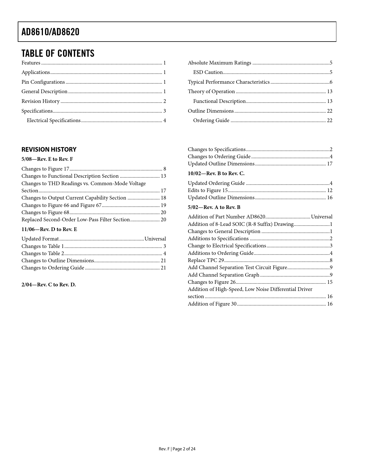 Seiten / Seite24 / 2 — AD8610/AD8620. TABLE OF CONTENTS. REVISION HISTORY. 5/08—Rev. E to Rev. …