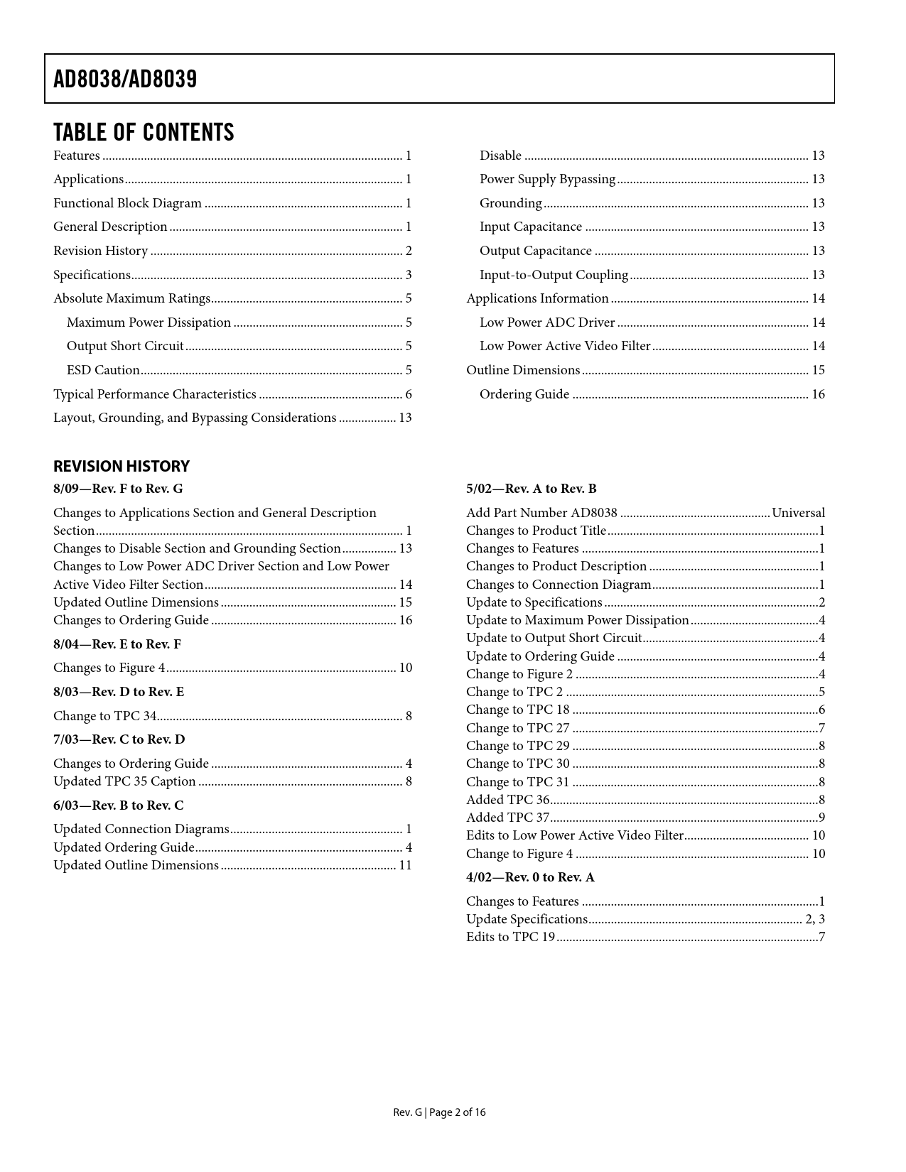 Seiten / Seite16 / 2 — AD8038/AD8039. TABLE OF CONTENTS. REVISION HISTORY. 8/09—Rev. F to Rev. …