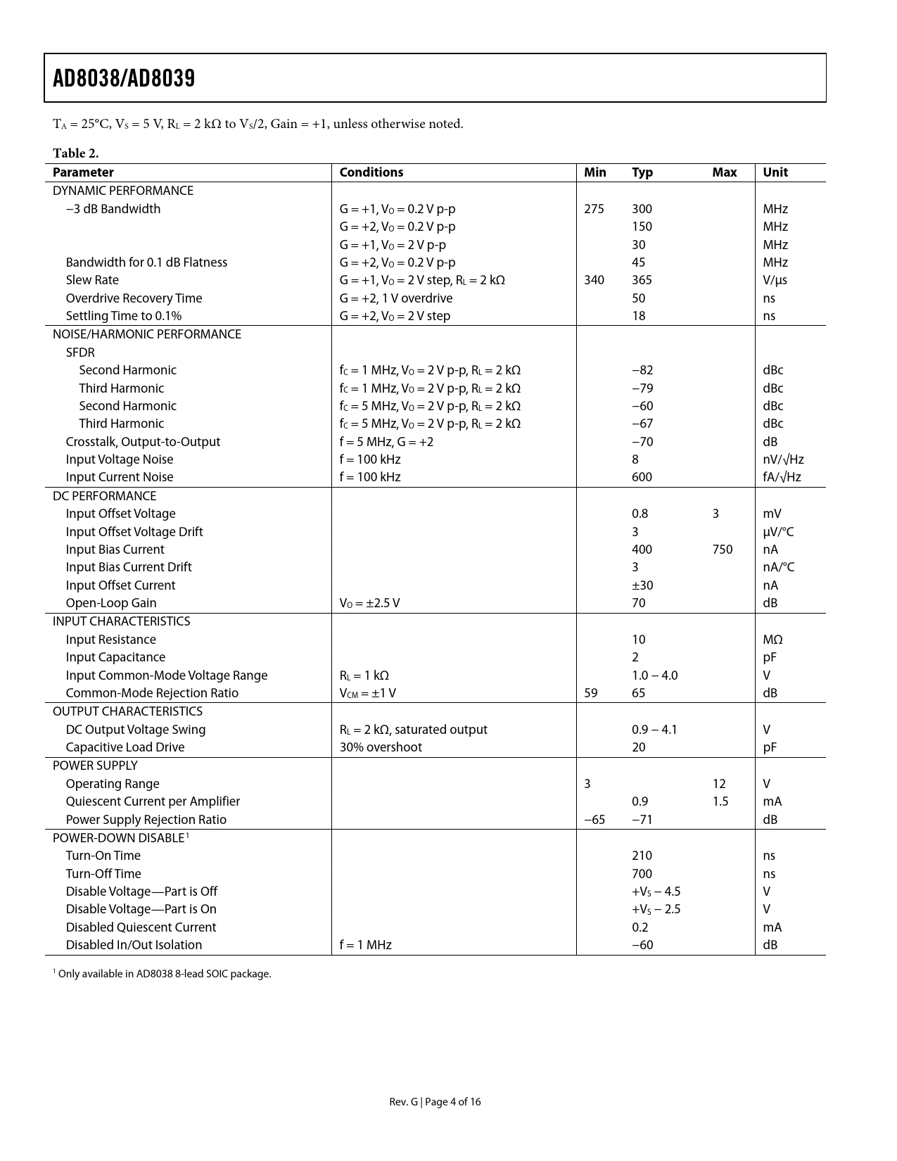 link to page 4 AD8038/AD8039 TA = 25°C, VS = 5 V, RL = 2 kΩ to VS/2, Gain = +1, unless otherwise noted. Table 2. ParameterConditionsMinTypMaxUnit DYNAMIC PERFORMANCE −3 dB Bandwidth G = +1, VO = 0.2 V p-p 275 300 MHz G = +2, VO = 0.2 V p-p 150 MHz G = +1, VO = 2 V p-p 30 MHz Bandwidth for 0.1 dB Flatness G = +2, VO = 0.2 V p-p 45 MHz Slew Rate G = +1, VO = 2 V step, RL = 2 kΩ 340 365 V/μs Overdrive Recovery Time G = +2, 1 V overdrive 50 ns Settling Time to 0.1% G = +2, VO = 2 V step 18 ns NOISE/HARMONIC PERFORMANCE SFDR Second Harmonic fC = 1 MHz, VO = 2 V p-p, RL = 2 kΩ −82 dBc Third Harmonic fC = 1 MHz, VO = 2 V p-p, RL = 2 kΩ −79 dBc Second Harmonic fC = 5 MHz, VO = 2 V p-p, RL = 2 kΩ −60 dBc Third Harmonic fC = 5 MHz, VO = 2 V p-p, RL = 2 kΩ −67 dBc Crosstalk, Output-to-Output f = 5 MHz, G = +2 −70 dB Input Voltage Noise f = 100 kHz 8 nV/√Hz Input Current Noise f = 100 kHz 600 fA/√Hz DC PERFORMANCE Input Offset Voltage 0.8 3 mV Input Offset Voltage Drift 3 μV/°C Input Bias Current 400 750 nA Input Bias Current Drift 3 nA/°C Input Offset Current ±30 nA Open-Loop Gain VO = ±2.5 V 70 dB INPUT CHARACTERISTICS Input Resistance 10 MΩ Input Capacitance 2 pF Input Common-Mode Voltage Range RL = 1 kΩ 1.0 − 4.0 V Common-Mode Rejection Ratio VCM = ±1 V 59 65 dB OUTPUT CHARACTERISTICS DC Output Voltage Swing RL = 2 kΩ, saturated output 0.9 − 4.1 V Capacitive Load Drive 30% overshoot 20 pF POWER SUPPLY Operating Range 3 12 V Quiescent Current per Amplifier 0.9 1.5 mA Power Supply Rejection Ratio −65 −71 dB POWER-DOWN DISABLE1 Turn-On Time 210 ns Turn-Off Time 700 ns Disable Voltage—Part is Off +VS − 4.5 V Disable Voltage—Part is On +VS − 2.5 V Disabled Quiescent Current 0.2 mA Disabled In/Out Isolation f = 1 MHz −60 dB 1 Only available in AD8038 8-lead SOIC package. Rev. G | Page 4 of 16 Document Outline FEATURES APPLICATIONS GENERAL DESCRIPTION FUNCTIONAL BLOCK DIAGRAM TABLE OF CONTENTS REVISION HISTORY SPECIFICATIONS ABSOLUTE MAXIMUM RATINGS MAXIMUM POWER DISSIPATION OUTPUT SHORT CIRCUIT ESD CAUTION TYPICAL PERFORMANCE CHARACTERISTICS LAYOUT, GROUNDING, AND BYPASSING CONSIDERATIONS DISABLE POWER SUPPLY BYPASSING GROUNDING INPUT CAPACITANCE OUTPUT CAPACITANCE INPUT-TO-OUTPUT COUPLING APPLICATIONS INFORMATION LOW POWER ADC DRIVER LOW POWER ACTIVE VIDEO FILTER OUTLINE DIMENSIONS ORDERING GUIDE