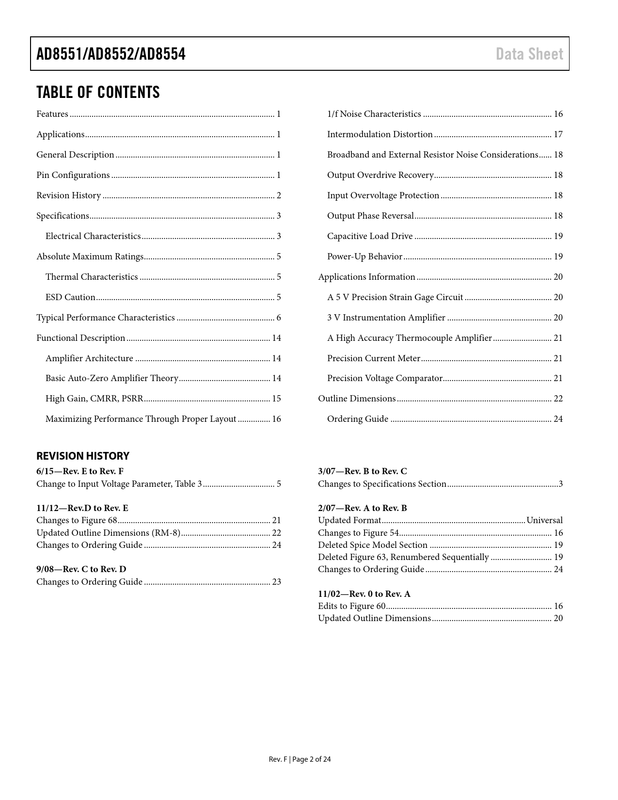 link to page 1 link to page 1 link to page 1 link to page 1 link to page 2 link to page 3 link to page 3 link to page 5 link to page 5 link to page 5 link to page 6 link to page 14 link to page 14 link to page 14 link to page 15 link to page 16 link to page 16 link to page 17 link to page 18 link to page 18 link to page 18 link to page 18 link to page 19 link to page 19 link to page 20 link to page 20 link to page 20 link to page 21 link to page 21 link to page 21 link to page 22 link to page 24 AD8551/AD8552/AD8554Data SheetTABLE OF CONTENTS Features .. 1 1/f Noise Characteristics ... 16 Applications ... 1 Intermodulation Distortion .. 17 General Description ... 1 Broadband and External Resistor Noise Considerations .. 18 Pin Configurations ... 1 Output Overdrive Recovery .. 18 Revision History ... 2 Input Overvoltage Protection ... 18 Specifications ... 3 Output Phase Reversal ... 18 Electrical Characteristics ... 3 Capacitive Load Drive ... 19 Absolute Maximum Ratings .. 5 Power-Up Behavior .. 19 Thermal Characteristics .. 5 Applications Information .. 20 ESD Caution .. 5 A 5 V Precision Strain Gage Circuit .. 20 Typical Performance Characteristics ... 6 3 V Instrumentation Amplifier .. 20 Functional Description .. 14 A High Accuracy Thermocouple Amplifier ... 21 Amplifier Architecture .. 14 Precision Current Meter .. 21 Basic Auto-Zero Amplifier Theory .. 14 Precision Voltage Comparator .. 21 High Gain, CMRR, PSRR .. 15 Outline Dimensions ... 22 Maximizing Performance Through Proper Layout ... 16 Ordering Guide .. 24 REVISION HISTORY6/15—Rev. E to Rev. F3/07—Rev. B to Rev. C Change to Input Voltage Parameter, Table 3 ... 5 Changes to Specifications Section ... 3 11/12—Rev.D to Rev. E2/07—Rev. A to Rev. B Changes to Figure 68 .. 21 Updated Format .. Universal Updated Outline Dimensions (RM-8) ... 22 Changes to Figure 54 .. 16 Changes to Ordering Guide .. 24 Deleted Spice Model Section .. 19 Deleted Figure 63, Renumbered Sequentially .. 19 9/08—Rev. C to Rev. D Changes to Ordering Guide .. 24 Changes to Ordering Guide .. 23 11/02—Rev. 0 to Rev. A Edits to Figure 60 .. 16 Updated Outline Dimensions ... 20 Rev. F | Page 2 of 24 Document Outline FEATURES APPLICATIONS GENERAL DESCRIPTION PIN CONFIGURATIONS TABLE OF CONTENTS REVISION HISTORY SPECIFICATIONS ELECTRICAL CHARACTERISTICS ABSOLUTE MAXIMUM RATINGS THERMAL CHARACTERISTICS ESD CAUTION TYPICAL PERFORMANCE CHARACTERISTICS FUNCTIONAL DESCRIPTION AMPLIFIER ARCHITECTURE BASIC AUTO-ZERO AMPLIFIER THEORY Auto-Zero Phase Amplification Phase HIGH GAIN, CMRR, PSRR MAXIMIZING PERFORMANCE THROUGHPROPER LAYOUT 1/f NOISE CHARACTERISTICS INTERMODULATION DISTORTION BROADBAND AND EXTERNAL RESISTOR NOISE CONSIDERATIONS OUTPUT OVERDRIVE RECOVERY INPUT OVERVOLTAGE PROTECTION OUTPUT PHASE REVERSAL CAPACITIVE LOAD DRIVE POWER-UP BEHAVIOR APPLICATIONS INFORMATION A 5 V PRECISION STRAIN GAGE CIRCUIT 3 V INSTRUMENTATION AMPLIFIER A HIGH ACCURACY THERMOCOUPLE AMPLIFIER PRECISION CURRENT METER PRECISION VOLTAGE COMPARATOR OUTLINE DIMENSIONS ORDERING GUIDE
