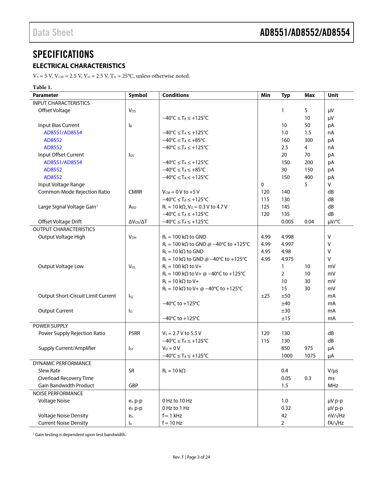 Data SheetAD8551/AD8552/AD8554SPECIFICATIONS ELECTRICAL CHARACTERISTICS VS = 5 V, VCM = 2.5 V, VO = 2.5 V, TA = 25°C, unless otherwise noted. Table 1. ParameterSymbolConditionsMinTypMaxUnit INPUT CHARACTERISTICS Offset Voltage VOS 1 5 μV −40°C ≤ TA ≤ +125°C 10 μV Input Bias Current IB 10 50 pA AD8551/AD8554 −40°C ≤ TA ≤ +125°C 1.0 1.5 nA AD8552 −40°C ≤ TA ≤ +85°C 160 300 pA AD8552 −40°C ≤ TA ≤ +125°C 2.5 4 nA Input Offset Current IOS 20 70 pA AD8551/AD8554 −40°C ≤ TA ≤ +125°C 150 200 pA AD8552 −40°C ≤ TA ≤ +85°C 30 150 pA AD8552 −40°C ≤ TA ≤ +125°C 150 400 pA Input Voltage Range 0 5 V Common-Mode Rejection Ratio CMRR VCM = 0 V to +5 V 120 140 dB −40°C ≤ TA ≤ +125°C 115 130 dB Large Signal Voltage Gain1 AVO RL = 10 kΩ, VO = 0.3 V to 4.7 V 125 145 dB −40°C ≤ TA ≤ +125°C 120 135 dB Offset Voltage Drift ΔVOS/ΔT −40°C ≤ TA ≤ +125°C 0.005 0.04 μV/°C OUTPUT CHARACTERISTICS Output Voltage High VOH RL = 100 kΩ to GND 4.99 4.998 V RL = 100 kΩ to GND @ −40°C to +125°C 4.99 4.997 V RL = 10 kΩ to GND 4.95 4.98 V RL = 10 kΩ to GND @ −40°C to +125°C 4.95 4.975 V Output Voltage Low VOL RL = 100 kΩ to V+ 1 10 mV RL = 100 kΩ to V+ @ −40°C to +125°C 2 10 mV RL = 10 kΩ to V+ 10 30 mV RL = 10 kΩ to V+ @ −40°C to +125°C 15 30 mV Output Short-Circuit Limit Current ISC ±25 ±50 mA −40°C to +125°C ±40 mA Output Current IO ±30 mA −40°C to +125°C ±15 mA POWER SUPPLY Power Supply Rejection Ratio PSRR VS = 2.7 V to 5.5 V 120 130 dB −40°C ≤ TA ≤ +125°C 115 130 dB Supply Current/Amplifier ISY VO = 0 V 850 975 μA −40°C ≤ TA ≤ +125°C 1000 1075 μA DYNAMIC PERFORMANCE Slew Rate SR RL = 10 kΩ 0.4 V/μs Overload Recovery Time 0.05 0.3 ms Gain Bandwidth Product GBP 1.5 MHz NOISE PERFORMANCE Voltage Noise en p-p 0 Hz to 10 Hz 1.0 μV p-p en p-p 0 Hz to 1 Hz 0.32 μV p-p Voltage Noise Density en f = 1 kHz 42 nV/√Hz Current Noise Density in f = 10 Hz 2 fA/√Hz 1 Gain testing is dependent upon test bandwidth. Rev. F | Page 3 of 24 Document Outline FEATURES APPLICATIONS GENERAL DESCRIPTION PIN CONFIGURATIONS TABLE OF CONTENTS REVISION HISTORY SPECIFICATIONS ELECTRICAL CHARACTERISTICS ABSOLUTE MAXIMUM RATINGS THERMAL CHARACTERISTICS ESD CAUTION TYPICAL PERFORMANCE CHARACTERISTICS FUNCTIONAL DESCRIPTION AMPLIFIER ARCHITECTURE BASIC AUTO-ZERO AMPLIFIER THEORY Auto-Zero Phase Amplification Phase HIGH GAIN, CMRR, PSRR MAXIMIZING PERFORMANCE THROUGHPROPER LAYOUT 1/f NOISE CHARACTERISTICS INTERMODULATION DISTORTION BROADBAND AND EXTERNAL RESISTOR NOISE CONSIDERATIONS OUTPUT OVERDRIVE RECOVERY INPUT OVERVOLTAGE PROTECTION OUTPUT PHASE REVERSAL CAPACITIVE LOAD DRIVE POWER-UP BEHAVIOR APPLICATIONS INFORMATION A 5 V PRECISION STRAIN GAGE CIRCUIT 3 V INSTRUMENTATION AMPLIFIER A HIGH ACCURACY THERMOCOUPLE AMPLIFIER PRECISION CURRENT METER PRECISION VOLTAGE COMPARATOR OUTLINE DIMENSIONS ORDERING GUIDE