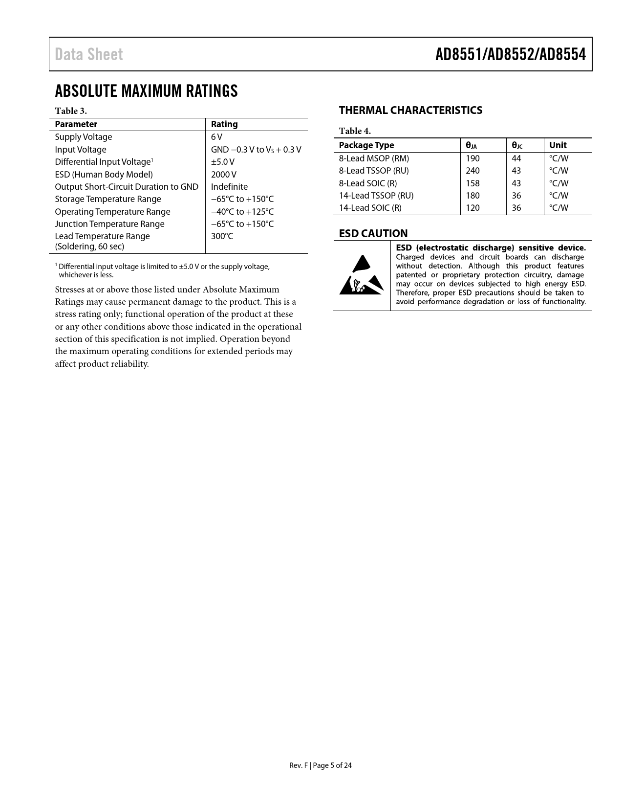 Data Sheet AD8551/AD8552/AD8554 ABSOLUTE MAXIMUM RATINGS Table 3 THERMAL CHARACTERISTICS Parameter Rating Table 4 Package Type