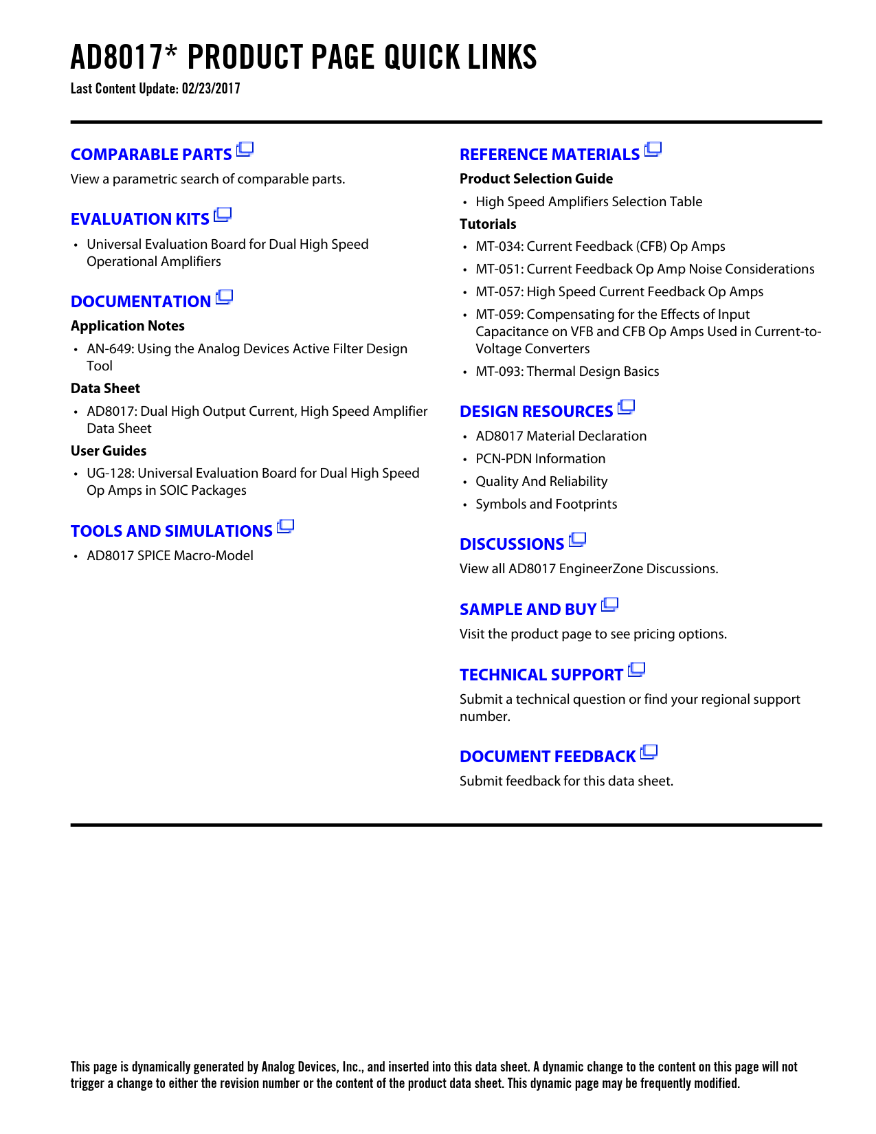 AD8017* PRODUCT PAGE QUICK LINKS Last Content Update: 02/23/2017 COMPARABLE PARTS REFERENCE MATERIALS