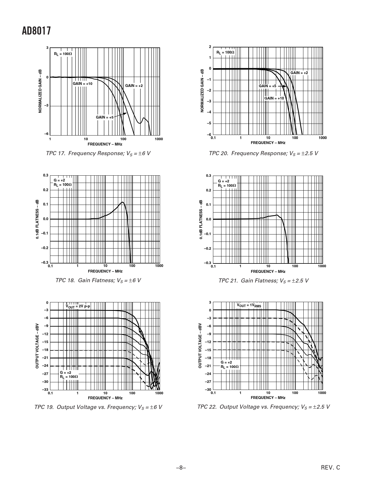 TPC 19. Output Voltage vs. Frequency; V TPC 22. Output Voltage vs. Frequency; V S = ±6 V S = ±2.5 V –8– REV. C