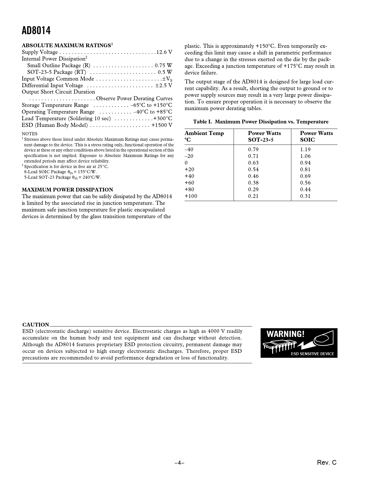 AD8014. ABSOLUTE MAXIMUM RATINGS1. Table I. Maximum Power Dissipation vs. Temperature. Ambient Temp. Power Watts. SOT-23-5. SOIC