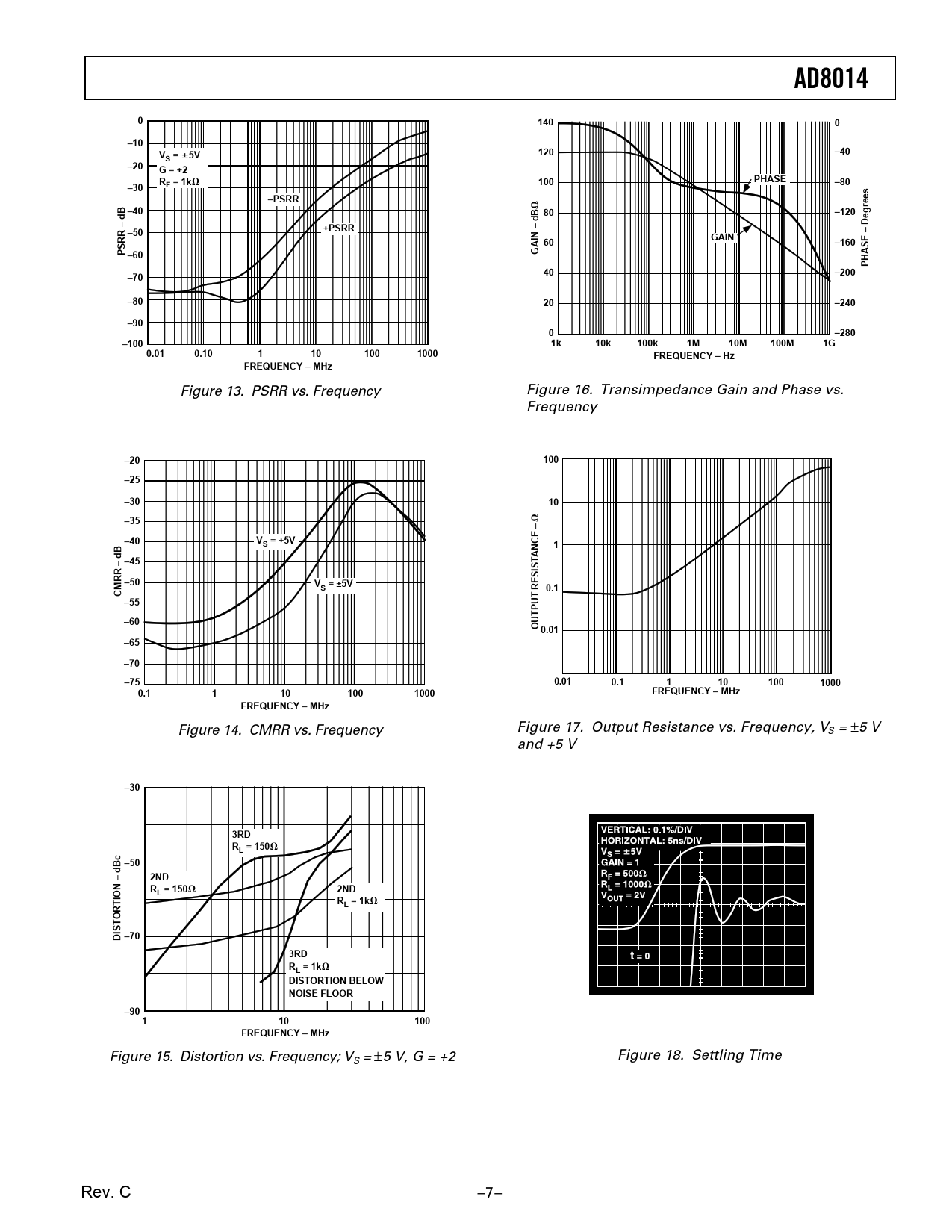 AD801401400–10V120–40S = 6 5V–20G = +2RPHASEF = 1k V –80–30100–PSRR–40 V 80–120grees–50+PSRR60GAIN–160PSRR – dB –60GAIN – dBPHASE – De–7040–200–8020–240–900–280–1001k 10k 100k 1M 10M 100M 1G0.010.101101001000FREQUENCY – HzFREQUENCY – MHz Figure 13. PSRR vs. Frequency Figure 16. Transimpedance Gain and Phase vs. Frequency –20100–25–3010–35 V –40VS = +5V1–45–50VCMRR – dBS = ±5V0.1–55–60OUTPUT RESISTANCE – 0.01–65–70 –750.010.111010010000.11101001000FREQUENCY – MHzFREQUENCY – MHz Figure 14. CMRR vs. Frequency Figure 17. Output Resistance vs. Frequency, VS = ±5 V and +5 V –303RDRL = 150 V –502NDR2NDL = 150 V RL = 1k V DISTORTION – dBc –70 ␣ ␣ 3RDRL = 1k V DISTORTION BELOWNOISE FLOOR–90 110100FREQUENCY – MHz Figure 15. Distortion vs. Frequency; V Figure 18. Settling Time S = ±5 V, G = +2 Rev. C –7–