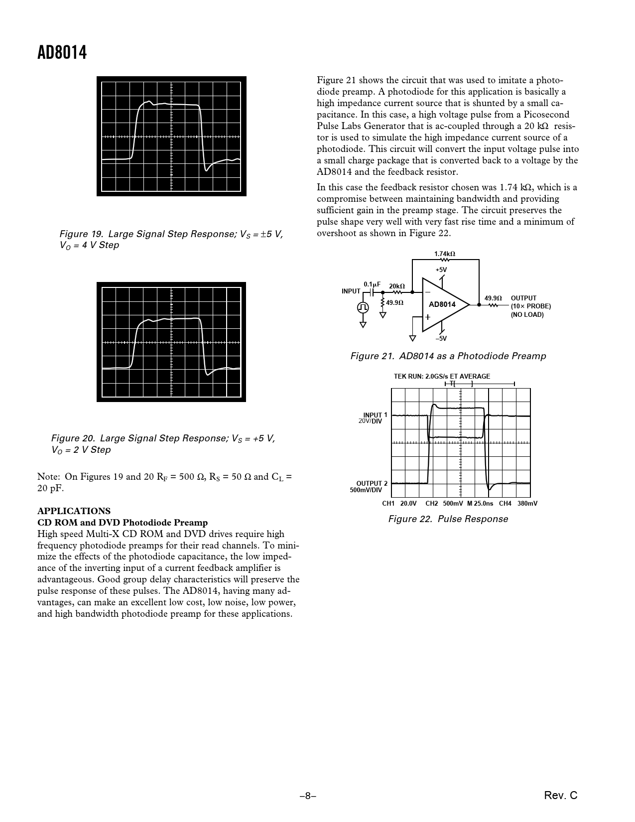 Figure 21 shows the circuit that was used to imitate a photo- diode preamp. A photodiode for this application is basically a high impedance current source that is shunted by a small ca- pacitance. In this case, a high voltage pulse from a Picosecond Pulse Labs Generator that is ac-coupled through a 20 kΩ resis- tor is used to simulate the high impedance current source of a photodiode. This circuit will convert the input voltage pulse into a small charge package that is converted back to a voltage by the AD8014 and the feedback resistor. In this case the feedback resistor chosen was 1.74 kΩ, which is a compromise between maintaining bandwidth and providing sufficient gain in the preamp stage. The circuit preserves the pulse shape very well with very fast rise time and a minimum of Figure 19. Large Signal Step Response; V overshoot as shown in Figure 22. S = ±5 V, VO = 4 V Step