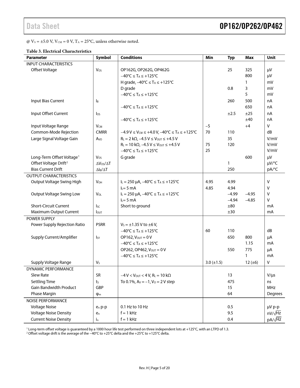Data Sheet OP162/OP262/OP462 Table 3 Electrical Characteristics Parameter Symbol Conditions Min Typ Max Unit