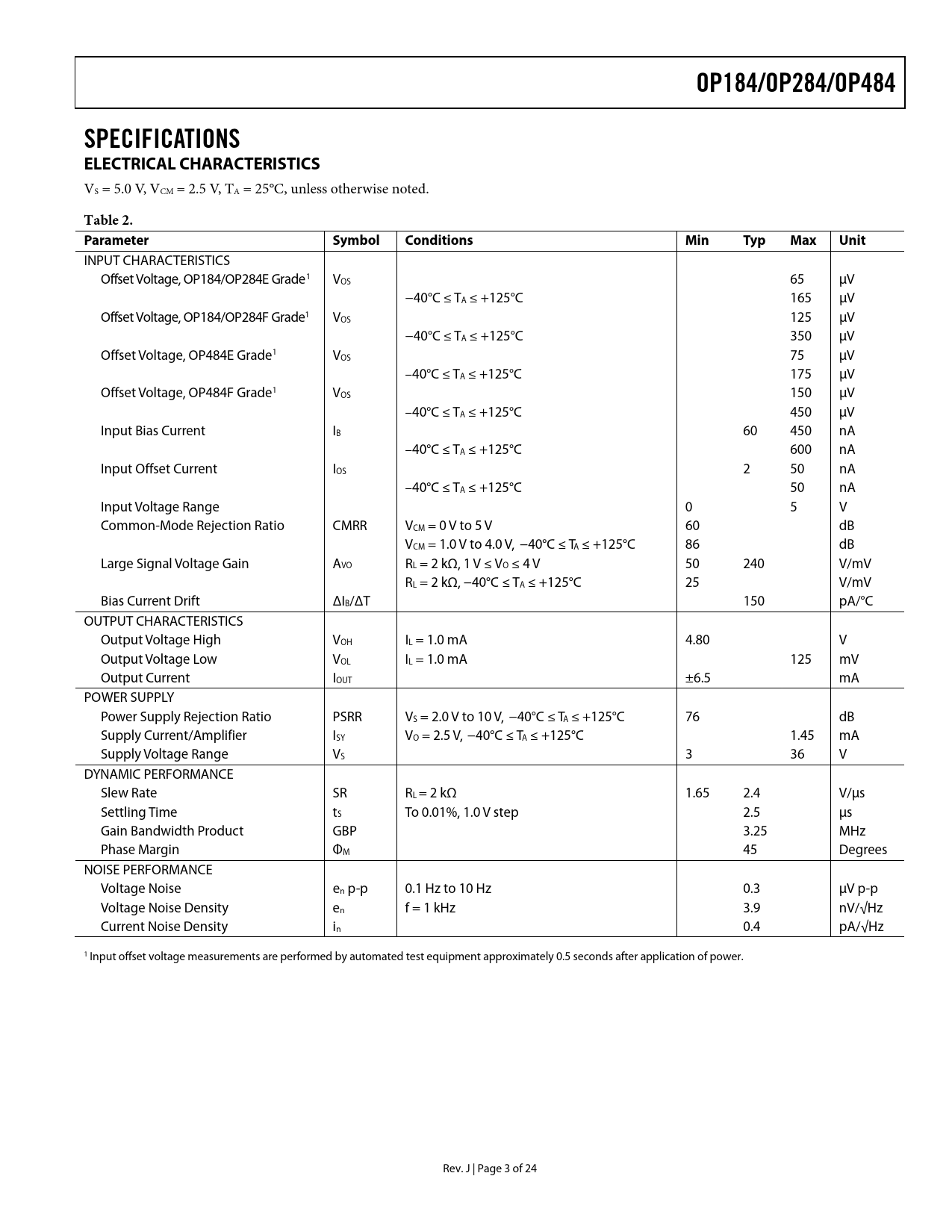 OP184/OP284/OP484 SPECIFICATIONS ELECTRICAL CHARACTERISTICS Table 2 Parameter Symbol Conditions Min Typ Max Unit