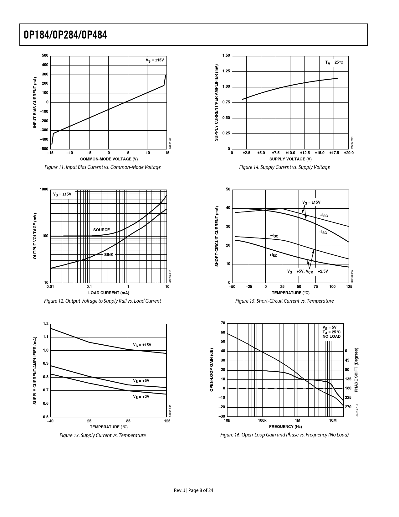 OP184/OP284/OP4845001.50VS = ±15VT400A = 25°CmA)1.25300R (A)IEn200IF(L1.00PNT100R AM0E0.75CURRE/PASNT–100BI0.50UT –200CURREINPY–300L P0.25UP–400 011 S 014 –500 00293- 0 00293- –15–10–50510150±2.5±5.0±7.5±10.0±12.5±15.0±17.5±20.0COMMON-MODE VOLTAGE (V)SUPPLY VOLTAGE (V) Figure 11. Input Bias Current vs. Common-Mode Voltage Figure 14. Supply Current vs. Supply Voltage 100050VS = ±15VVS = ±15V40)mA)V(+ISCm (NTGE30SOURCE–ISC100CURRE–IOLTATSCT V U20RCUITP-CISINK+ISCOURTHO10SVS = +5V, VCM = +2.5V 012 015 10 00293- 0 00293- 0.010.1110–50–250255075100125LOAD CURRENT (mA)TEMPERATURE (°C) Figure 12. Output Voltage to Supply Rail vs. Load Current Figure 15. Short-Circuit Current vs. Temperature 1.270VS = 5V60TA = 25°C1.1NO LOADmA)50VS = ±15VR ()1.0IE400dBIF(rees)L PIN30450.9Deg (/AMGAT2090FNTHI0.8SV-LOOP10135S = +5VNEECURRE0180Y0.7OPHASLPPVS = +3V–10225UP S0.6 013 –20270 016 0.5 00293- –30 00293- –40258512510k100k1M10MTEMPERATURE (°C)FREQUENCY (Hz) Figure 13. Supply Current vs. Temperature Figure 16. Open-Loop Gain and Phase vs. Frequency (No Load) Rev. J | Page 8 of 24 Document Outline Features Applications General Description Pin Configurations Table of Contents Revision History Specifications Electrical Characteristics Absolute Maximum Ratings Thermal Resistance ESD Caution Typical Performance Characteristics Applications Information Functional Description Input Overvoltage Protection Output Phase Reversal Designing Low Noise Circuits in Single-Supply Applications Overdrive Recovery Single-Supply, 3 V Instrumentation Amplifier 2.5 V Reference from a 3 V Supply 5 V Only, 12-Bit DAC Swings Rail-to-Rail High-Side Current Monitor Capacitive Load Drive Capability Low Dropout Regulator with Current Limiting 3 V, 50 Hz/60 Hz Active Notch Filter with False Ground Outline Dimensions Ordering Guide