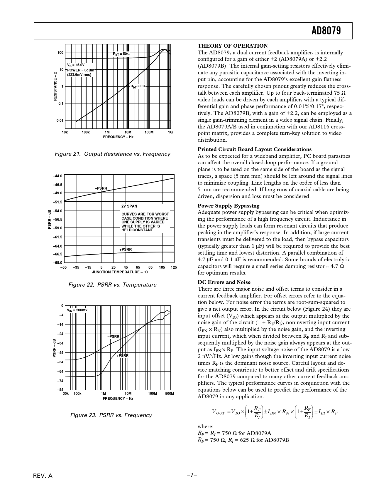 AD8079THEORY OF OPERATION100R The AD8079, a dual current feedback amplifier, is internally bT = 50 Ω configured for a gain of either +2 (AD8079A) or +2.2 VS = ± 5.0V (AD8079B). The internal gain-setting resistors effectively elimi- 10POWER = 0dBm Ω nate any parasitic capacitance associated with the inverting in- (223.6mV rms) put pin, accounting for the AD8079’s excellent gain flatness 1RbT = 0 Ω response. The carefully chosen pinout greatly reduces the cross- talk between each amplifier. Up to four back-terminated 75 Ω RESISTANCE – video loads can be driven by each amplifier, with a typical dif- 0.1 ferential gain and phase performance of 0.01%/0.17°, respec- tively. The AD8079B, with a gain of +2.2, can be employed as a 0.01 single gain-trimming element in a video signal chain. Finally, the AD8079A/B used in conjunction with our AD8116 cross- 10k100k1M10M100M1G point matrix, provides a complete turn-key solution to video FREQUENCY – Hz distribution. Printed Circuit Board Layout Considerations Figure 21. Output Resistance vs. Frequency As to be expected for a wideband amplifier, PC board parasitics can affect the overall closed-loop performance. If a ground plane is to be used on the same side of the board as the signal –44.0 traces, a space (5 mm min) should be left around the signal lines to minimize coupling. Line lengths on the order of less than –46.5–PSRR 5 mm are recommended. If long runs of coaxial cable are being –49.0 driven, dispersion and loss must be considered. 9–51.52V SPANPower Supply Bypassing–54.0 Adequate power supply bypassing can be critical when optimiz- CURVES ARE FOR WORST–56.5CASE CONDITION WHERE ing the performance of a high frequency circuit. Inductance in ONE SUPPLY IS VARIED the power supply leads can form resonant circuits that produce PSRR – dBWHILE THE OTHER IS–59.0HELD CONSTANT. peaking in the amplifier’s response. In addition, if large current –61.5 transients must be delivered to the load, then bypass capacitors –64.0 (typically greater than 1 µF) will be required to provide the best +PSRR–66.5 settling time and lowest distortion. A parallel combination of 4.7 µF and 0.1 µF is recommended. Some brands of electrolytic –69.0–55–35–15525456585105125 capacitors will require a small series damping resistor ≈ 4.7 Ω JUNCTION TEMPERATURE – ° C for optimum results. DC Errors and Noise Figure 22. PSRR vs. Temperature There are three major noise and offset terms to consider in a current feedback amplifier. For offset errors refer to the equa- tion below. For noise error the terms are root-sum-squared to 0V give a net output error. In the circuit below (Figure 24) they are IN = 200mV–4 input offset (VIO) which appears at the output multiplied by the noise gain of the circuit (1 + R –14 F/RI), noninverting input current (IBN × RN) also multiplied by the noise gain, and the inverting –24–PSRR input current, which when divided between RF and RI and sub- –34 sequently multiplied by the noise gain always appears at the out- put as I × BN RF. The input voltage noise of the AD8079 is a low –44PSRR – dB+PSRR 2 nV/√Hz. At low gains though the inverting input current noise –54 times RF is the dominant noise source. Careful layout and de- vice matching contribute to better offset and drift specifications –64 for the AD8079 compared to many other current feedback am- –74 plifiers. The typical performance curves in conjunction with the –84 equations below can be used to predict the performance of the 30k100k1M10M100M500M AD8079 in any application. FREQUENCY – Hz V =V × 1+ RF × R × 1+ RF × R Figure 23. PSRR vs. Frequency OUT IO N F R ± IBN R ± IBI I I where: RF = RI = 750 Ω for AD8079A RF = 750 Ω, RI = 625 Ω for AD8079B REV. A –7–