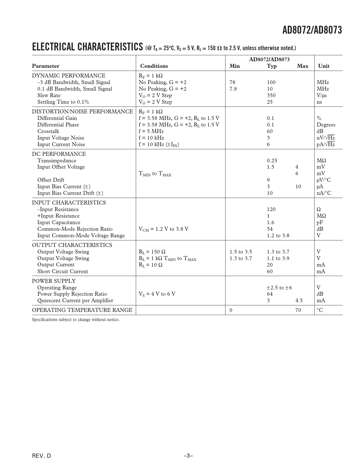 AD8072/AD8073ELECTRICAL CHARACTERISTICS (@ TA = 25 ⴗ C, VS = 5 V, RL = 150 ⍀ to 2.5 V, unless otherwise noted.)AD8072/AD8073ParameterConditionsMinTypMaxUnit DYNAMIC PERFORMANCE RF = 1 kΩ –3 dB Bandwidth, Small Signal No Peaking, G = +2 78 100 MHz 0.1 dB Bandwidth, Small Signal No Peaking, G = +2 7.8 10 MHz Slew Rate VO = 2 V Step 350 V/µs Settling Time to 0.1% VO = 2 V Step 25 ns DISTORTION/NOISE PERFORMANCE RF = 1 kΩ Differential Gain f = 3.58 MHz, G = +2, RL to 1.5 V 0.1 % Differential Phase f = 3.58 MHz, G = +2, RL to 1.5 V 0.1 Degrees Crosstalk f = 5 MHz 60 dB Input Voltage Noise f = 10 kHz 3 nV/√Hz Input Current Noise f = 10 kHz (± IIN) 6 pA/√Hz DC PERFORMANCE Transimpedance 0.25 MΩ Input Offset Voltage 1.5 4 mV TMIN to TMAX 6 mV Offset Drift 9 µV/°C Input Bias Current (± ) 3 10 µA Input Bias Current Drift (± ) 10 nA/°C INPUT CHARACTERISTICS –Input Resistance 120 Ω +Input Resistance 1 MΩ Input Capacitance 1.6 pF Common-Mode Rejection Ratio VCM = 1.2 V to 3.8 V 54 dB Input Common-Mode Voltage Range 1.2 to 3.8 V OUTPUT CHARACTERISTICS Output Voltage Swing RL = 150 Ω 1.5 to 3.5 1.3 to 3.7 V Output Voltage Swing RL = 1 kΩ TMIN to TMAX 1.3 to 3.7 1.1 to 3.9 V Output Current RL = 10 Ω 20 mA Short Circuit Current 60 mA POWER SUPPLY Operating Range ±2.5 to ±6 V Power Supply Rejection Ratio VS = 4 V to 6 V 64 dB Quiescent Current per Amplifier 3 4.5 mA OPERATING TEMPERATURE RANGE 0 70 °C Specifications subject to change without notice. REV. D –3–
