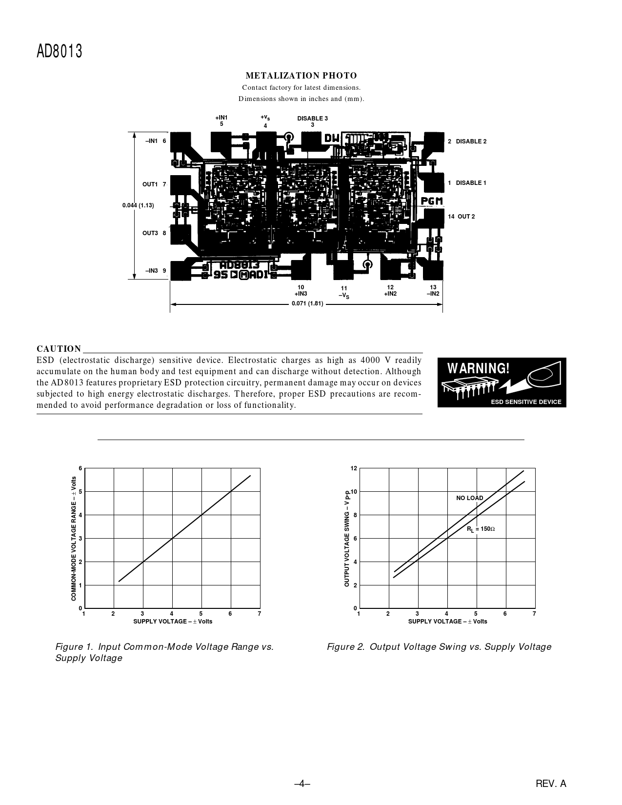 AD8013METALIZATION PHOTO Contact factory for latest dimensions. Dimensions shown in inches and (mm). +IN1+vsDISABLE 3543–IN1 62 DISABLE 21 DISABLE 1OUT1 70.044 (1.13)14 OUT 2OUT3 8–IN3 910111213+IN3–V+IN2–IN2S0.071 (1.81)CAUTION ESD (electrostatic discharge) sensitive device. Electrostatic charges as high as 4000 V readily accumulate on the human body and test equipment and can discharge without detection. Although WARNING! the AD8013 features proprietary ESD protection circuitry, permanent damage may occur on devices subjected to high energy electrostatic discharges. Therefore, proper ESD precautions are recom- mended to avoid performance degradation or loss of functionality. ESD SENSITIVE DEVICE612 ± Volts 510NO LOAD48RL = 150 Ω 36241OUTPUT VOLTAGE SWING – V p-p 2COMMON-MODE VOLTAGE RANGE –0012345671234567SUPPLY VOLTAGE – ± VoltsSUPPLY VOLTAGE – ± Volts Figure 1. Input Common-Mode Voltage Range vs. Figure 2. Output Voltage Swing vs. Supply Voltage Supply Voltage –4– REV. A