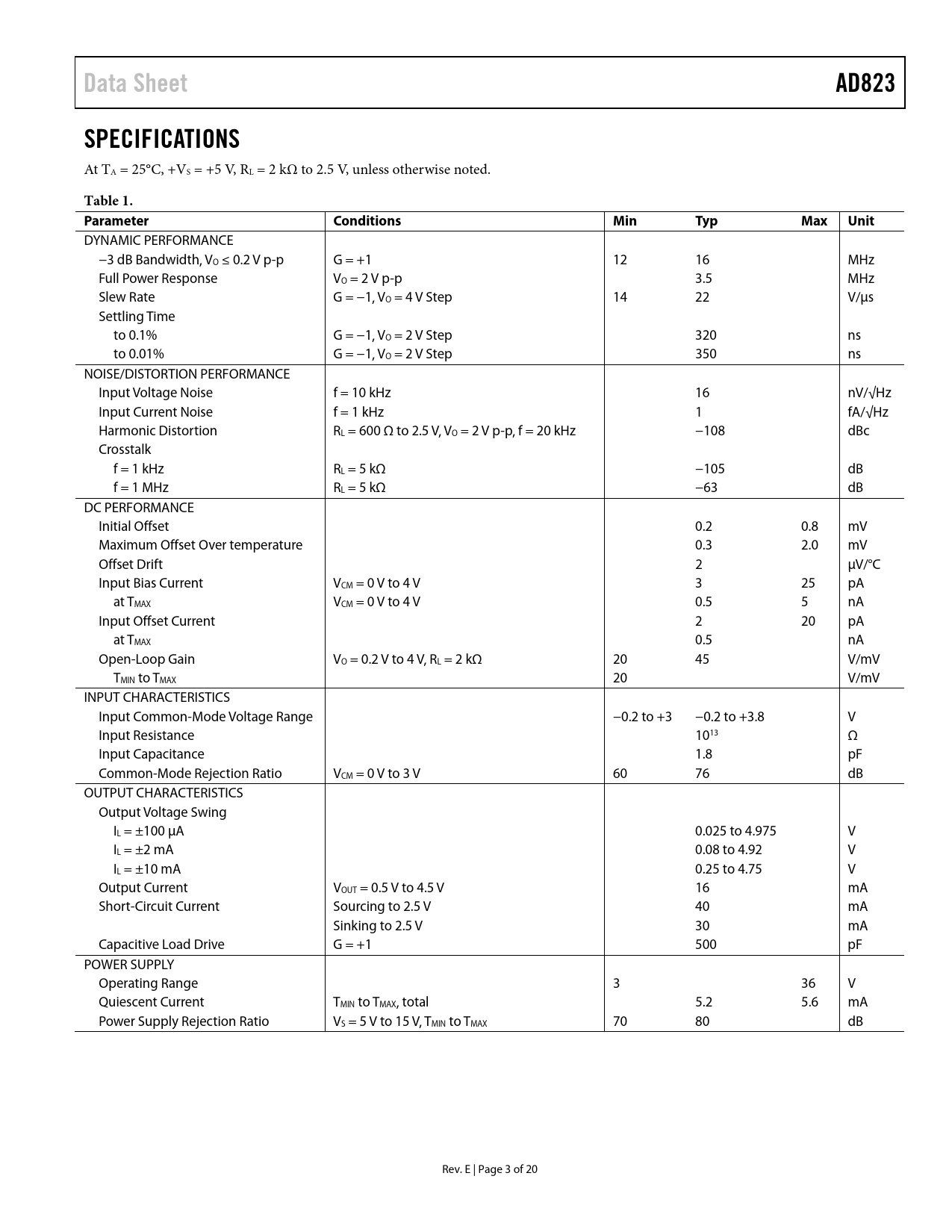 Data Sheet. AD823. SPECIFICATIONS. Table 1. Parameter. Conditions. Min. Typ. Max Unit