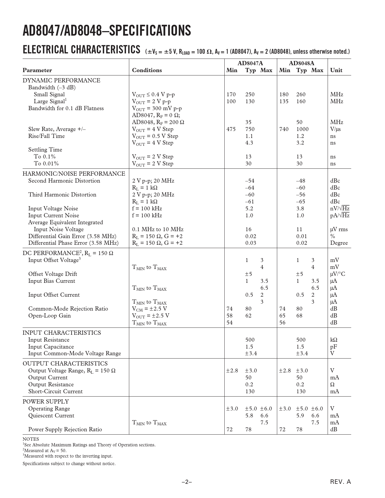 AD8047/AD8048–SPECIFICATIONS. ELECTRICAL CHARACTERISTICS (. VS =. 5 V, RLOAD = 100