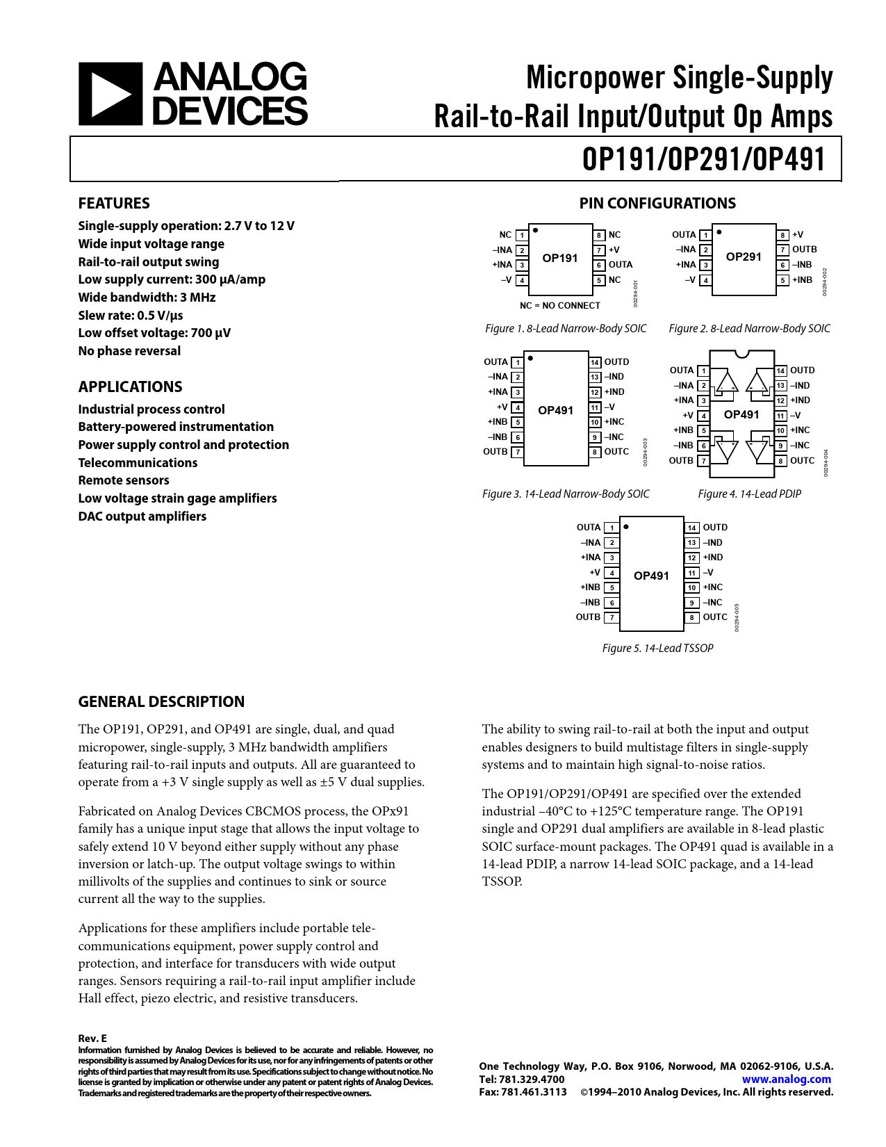 Micropower Single-Supply. Rail-to-Rail Input/Output Op Amps. OP191/OP291/OP491. FEATURES. PIN CONFIGURATIONS