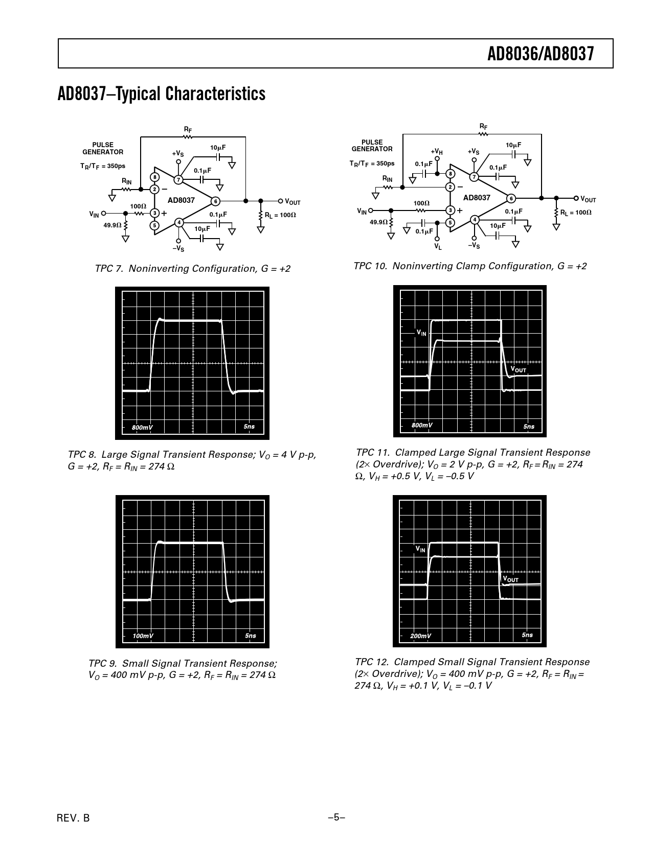 AD8036/AD8037AD8037–Typical CharacteristicsRRFFPULSEPULSE10F10FGENERATORGENERATOR+V+V+VSHSTTR/TF = 350ps0.1FR /T F = 350ps0.1F0.1FRRININAD8037AD8037VVOUTOUT100100VVIN0.1FRIN0.1FRL = 100L = 10049.949.910F10F0.1FV–V–VSSL TPC 7. Noninverting Configuration, G = +2 TPC 10. Noninverting Clamp Configuration, G = +2 TPC 8. Large Signal Transient Response; V TPC 11. Clamped Large Signal Transient Response O = 4 V p-p, G = +2, R (2× Overdrive); V F = RIN = 274 Ω O = 2 V p-p, G = +2, RF = RIN = 274 Ω, VH = +0.5 V, VL = –0.5 V TPC 9. Small Signal Transient Response; TPC 12. Clamped Small Signal Transient Response V (2× Overdrive); V O = 400 mV p-p, G = +2, RF = RIN = 274 Ω O = 400 mV p-p, G = +2, RF = RIN = 274 Ω, VH = +0.1 V, VL = –0.1 V REV. B –5–