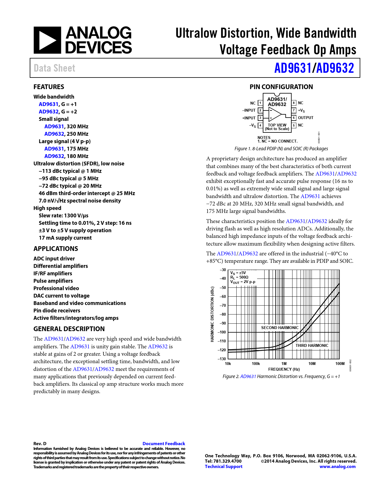 Ultralow Distortion, Wide Bandwidth. Voltage Feedback Op Amps. Data Sheet. AD9631/. AD9632. FEATURES. PIN CONFIGURATION