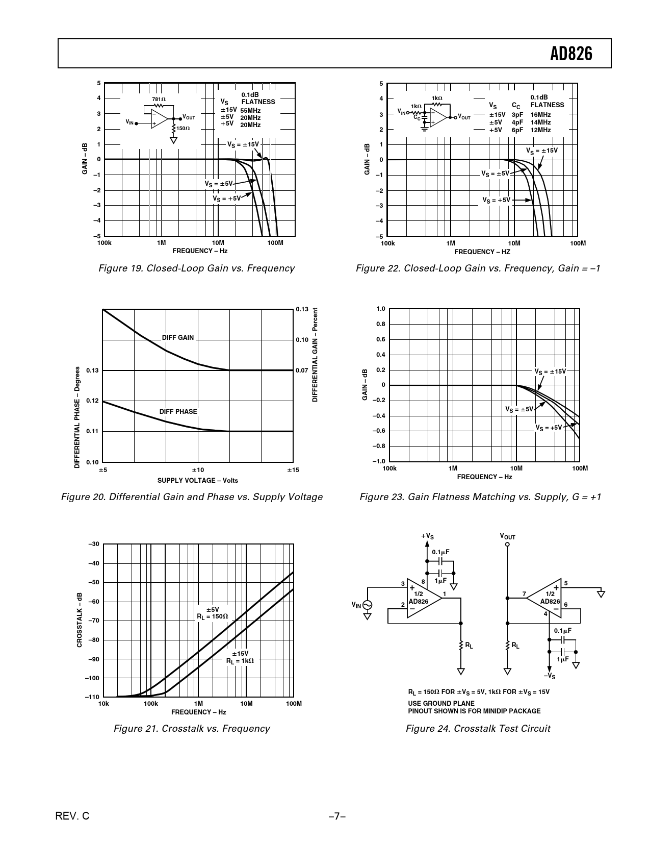 VS VOUT –30 0.1 F –40 –50 3 8 1 F 5 1/2 1 7 1/2 dB –60 – AD826 V 2 AD826 6 IN 5V R 4 –70 L = 150 0.1 F –80 CROSSTALK RL RL 15V –90 R 1 F L = 1k –100 –VS RL = 150 FOR VS = 5V, 1k FOR VS = 15V –110 10k 100k 1M 10M 100M USE GROUND PLANE FREQUENCY – Hz PINOUT SHOWN IS FOR MINIDIP PACKAGE