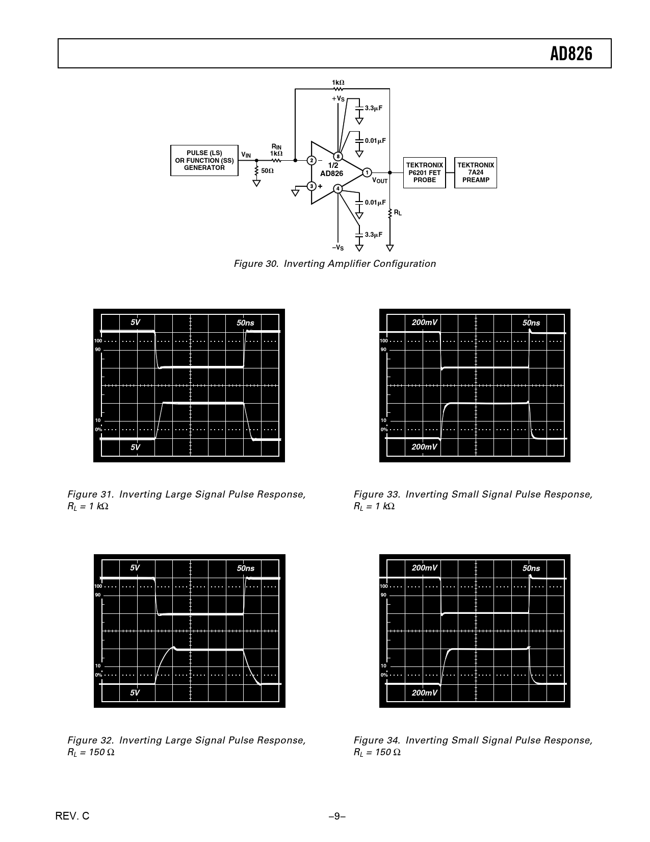 AD826. 3.3. 0.01. RIN. PULSE (LS). OR FUNCTION (SS). TEKTRONIX. GENERATOR. 1/2. P6201 FET. 7A24. VOUT. PROBE. PREAMP. –VS. 50ns. 200mV. 100