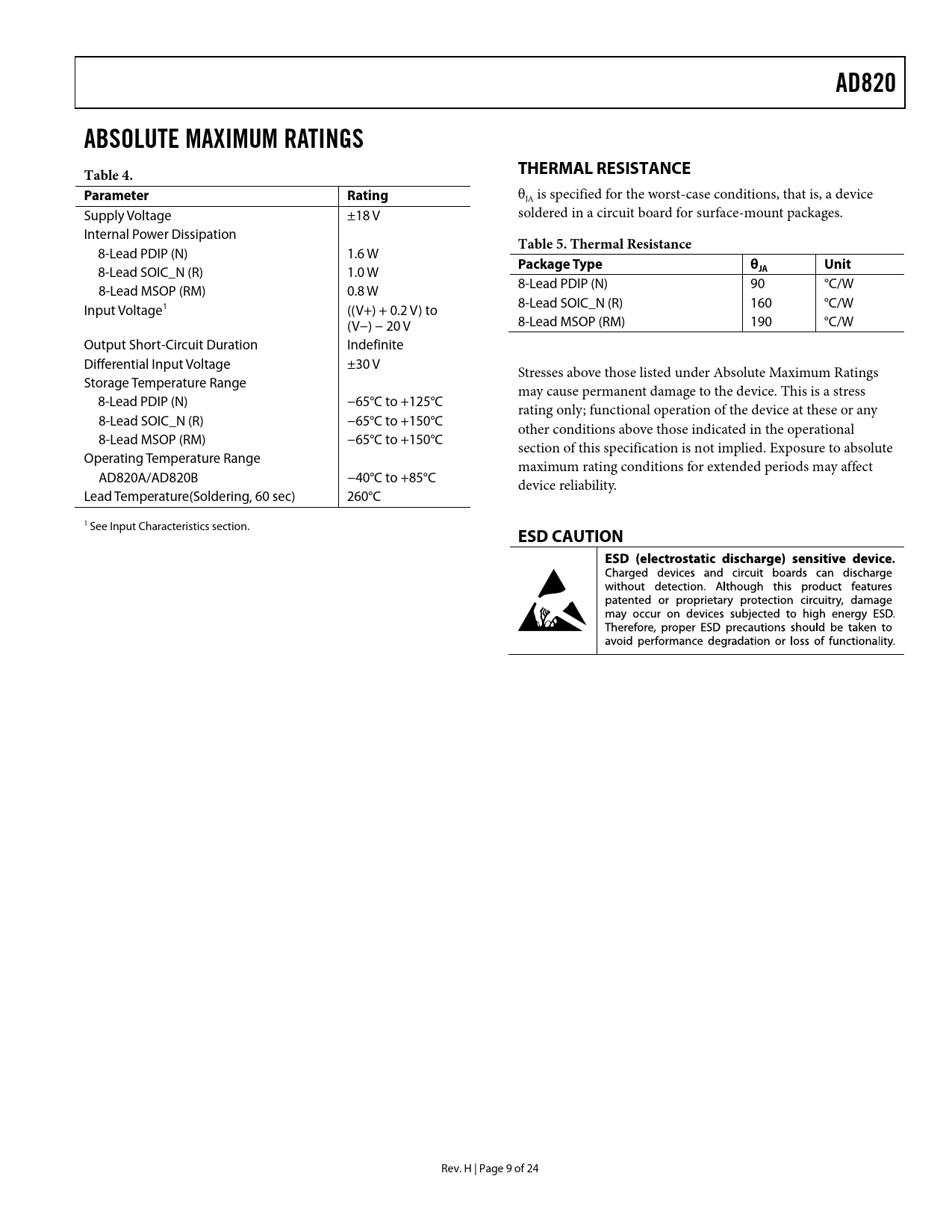AD820. ABSOLUTE MAXIMUM RATINGS Table 4. THERMAL RESISTANCE. Parameter. Rating. Table 5. Thermal Resistance. Package Type. Unit