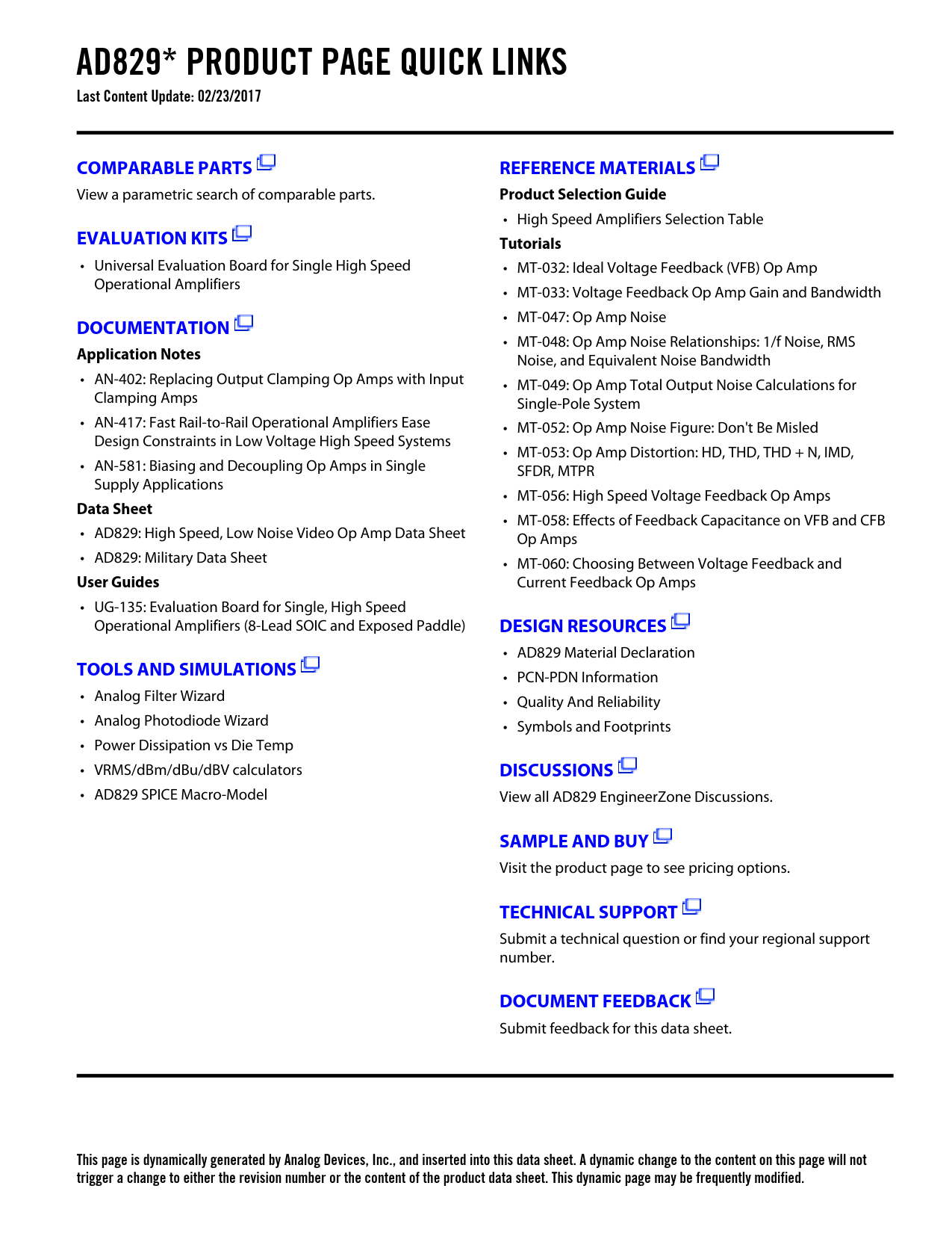 AD829* PRODUCT PAGE QUICK LINKS Last Content Update: 02/23/2017COMPARABLE PARTSREFERENCE MATERIALS View a parametric search of comparable parts. Product Selection Guide • High Speed Amplifiers Selection Table EVALUATION KITSTutorials • Universal Evaluation Board for Single High Speed • MT-032: Ideal Voltage Feedback (VFB) Op Amp Operational Amplifiers • MT-033: Voltage Feedback Op Amp Gain and Bandwidth • MT-047: Op Amp Noise DOCUMENTATION • MT-048: Op Amp Noise Relationships: 1/f Noise, RMS Application Notes Noise, and Equivalent Noise Bandwidth • AN-402: Replacing Output Clamping Op Amps with Input • MT-049: Op Amp Total Output Noise Calculations for Clamping Amps Single-Pole System • AN-417: Fast Rail-to-Rail Operational Amplifiers Ease • MT-052: Op Amp Noise Figure: Don't Be Misled Design Constraints in Low Voltage High Speed Systems • MT-053: Op Amp Distortion: HD, THD, THD + N, IMD, • AN-581: Biasing and Decoupling Op Amps in Single SFDR, MTPR Supply Applications • MT-056: High Speed Voltage Feedback Op Amps Data Sheet • MT-058: Effects of Feedback Capacitance on VFB and CFB • AD829: High Speed, Low Noise Video Op Amp Data Sheet Op Amps • AD829: Military Data Sheet • MT-060: Choosing Between Voltage Feedback and User Guides Current Feedback Op Amps • UG-135: Evaluation Board for Single, High Speed Operational Amplifiers (8-Lead SOIC and Exposed Paddle) DESIGN RESOURCES • AD829 Material Declaration TOOLS AND SIMULATIONS • PCN-PDN Information • Analog Filter Wizard • Quality And Reliability • Analog Photodiode Wizard • Symbols and Footprints • Power Dissipation vs Die Temp • VRMS/dBm/dBu/dBV calculators DISCUSSIONS • AD829 SPICE Macro-Model View all AD829 EngineerZone Discussions. SAMPLE AND BUY Visit the product page to see pricing options. TECHNICAL SUPPORT Submit a technical question or find your regional support number. DOCUMENT FEEDBACK Submit feedback for this data sheet. This page is dynamically generated by Analog Devices, Inc., and inserted into this data sheet. A dynamic change to the content on this page will not trigger a change to either the revision number or the content of the product data sheet. This dynamic page may be frequently modified. Document Outline Features General Description Connection Diagram Product Highlights Revision History Specifications Absolute Maximum Ratings Thermal Characteristics Metallization Photo ESD Caution Typical Performance Characteristics Test Circuits Theory of Operation Externally Compensating the AD829 Shunt Compensation Current Feedback Compensation Low Error Video Line Driver High Gain Video Bandwidth, 3-Op-Amp Instrumentation Amplifier Outline Dimensions Ordering Guide