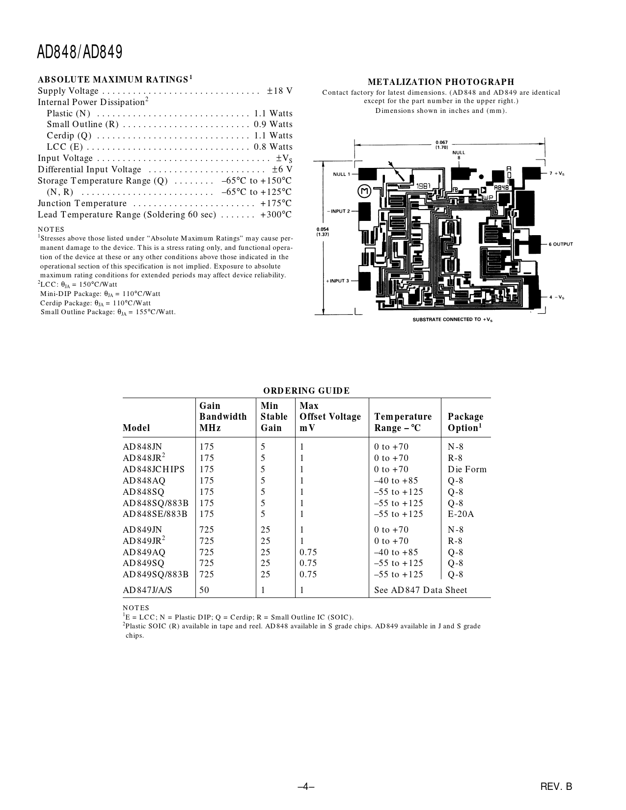 AD848/AD849 ABSOLUTE MAXIMUM RATINGS1 METALIZATION PHOTOGRAPH ORDERING GUIDE Gain Min Max Bandwidth Stable Offset Voltage