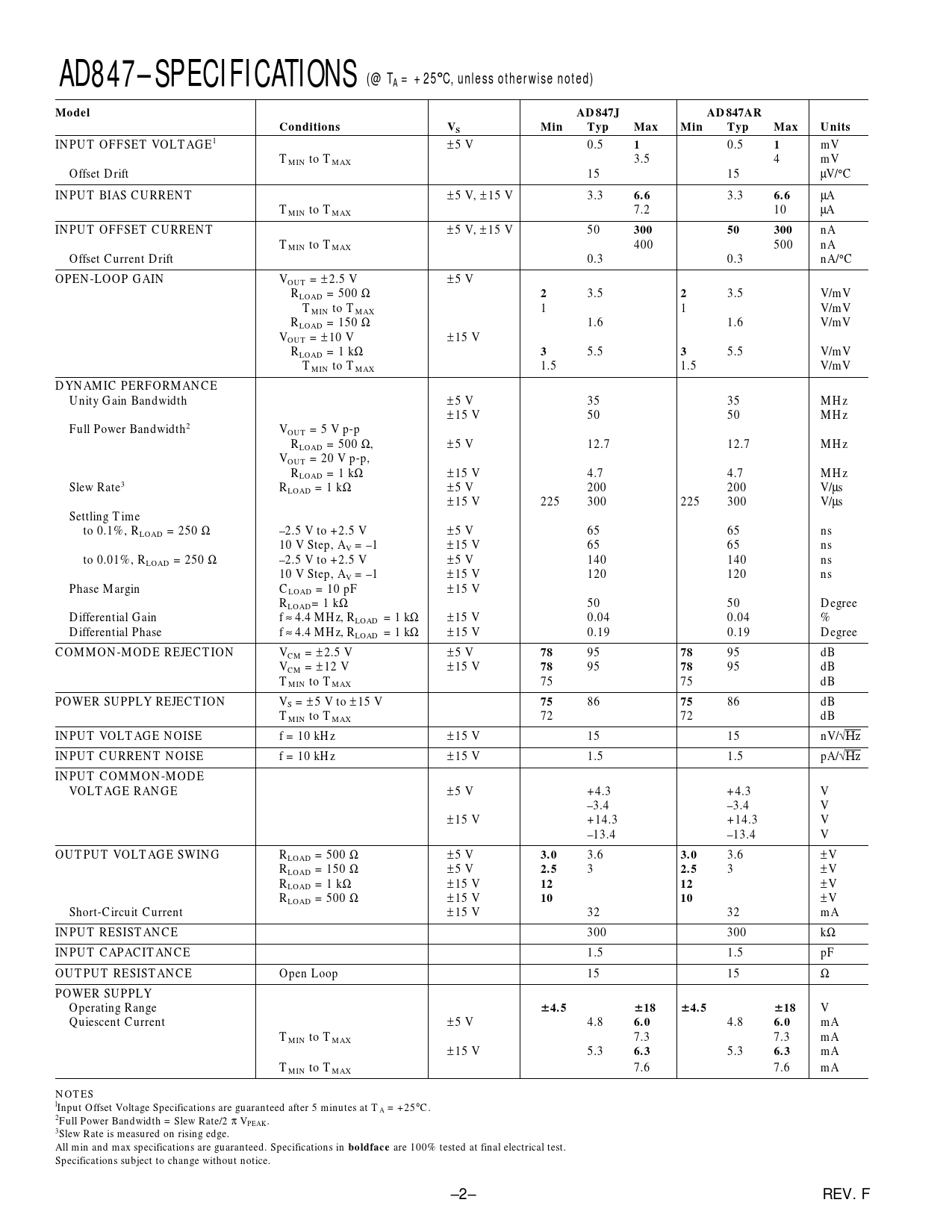 AD847–SPECIFICATIONS (@ TA = +25 C, unless otherwise noted) Model AD847J AD847AR Conditions Min Typ Max Units 6.6 300 3.0 2.5 4.5 6.0
