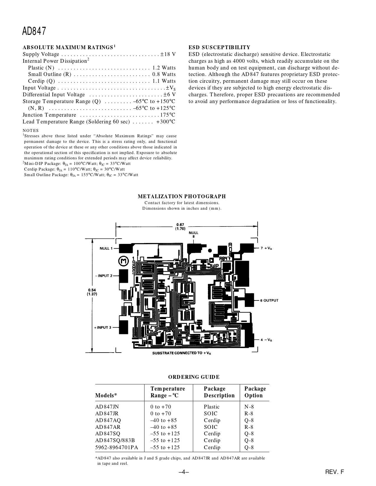 AD847 ABSOLUTE MAXIMUM RATINGS1 ESD SUSCEPTIBILITY METALIZATION PHOTOGRAPH ORDERING GUIDE Temperature Package Models* Range –