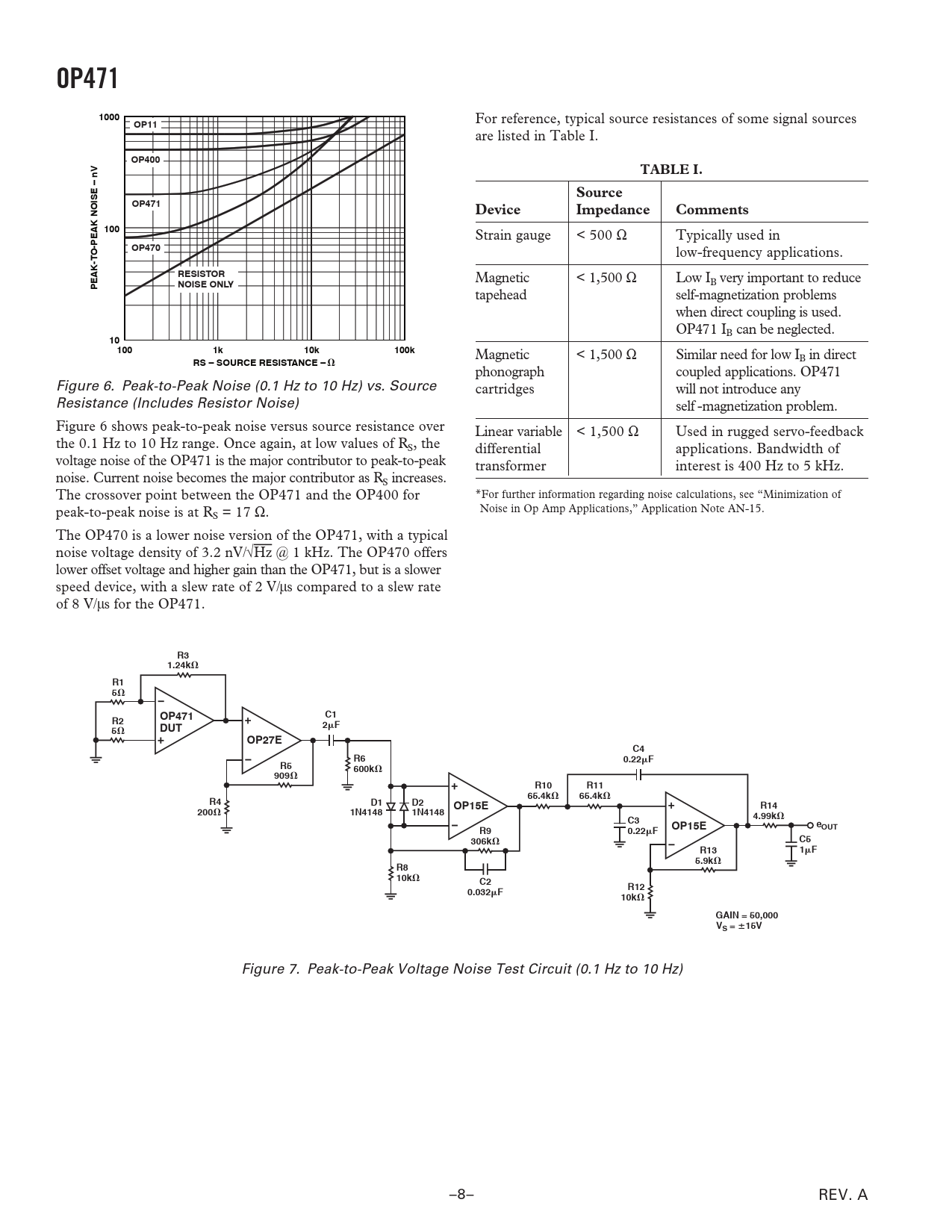 OP471. 1000. OP11. OP400. TABLE I. Source. Device. Impedance. Comments. 100. OP470. O-PEAK NOISE – nV. RESISTOR. PEAK-T. NOISE ONLY. 10k. 100k