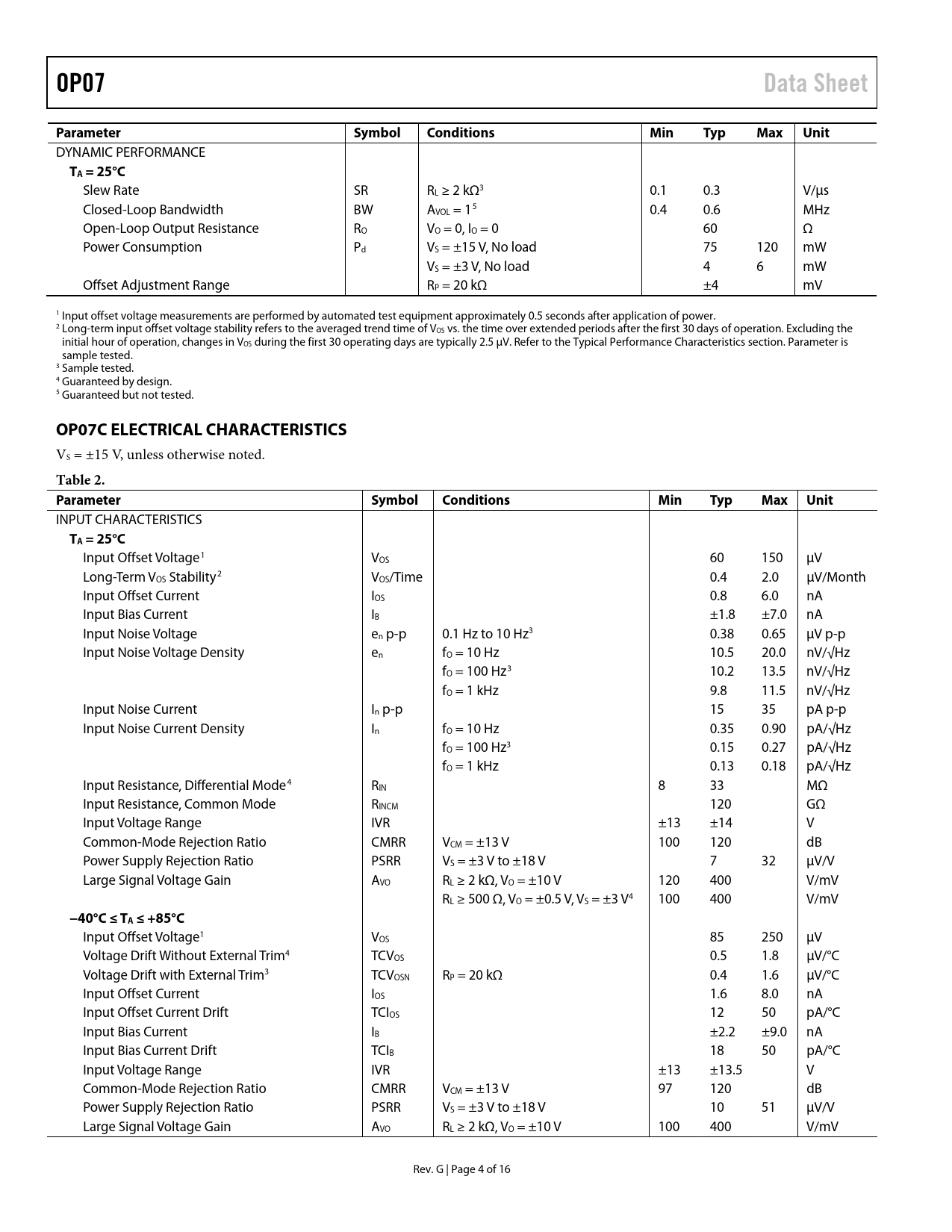 OP07 Data Sheet Parameter Symbol Conditions Min Typ Max Unit