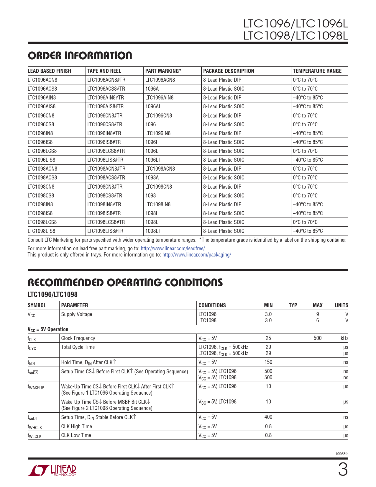 LTC1096/LTC1096L LTC1098/LTC1098L ORDER INFORMATIONLEAD BASED FINISHTAPE AND REELPART MARKING*PACKAGE DESCRIPTIONTEMPERATURE RANGE LTC1096ACN8 LTC1096ACN8#TR LTC1096ACN8 8-Lead Plastic DIP 0°C to 70°C LTC1096ACS8 LTC1096ACS8#TR 1096A 8-Lead Plastic SOIC 0°C to 70°C LTC1096AIN8 LTC1096AIN8#TR LTC1096AIN8 8-Lead Plastic DIP –40°C to 85°C LTC1096AIS8 LTC1096AIS8#TR 1096AI 8-Lead Plastic SOIC –40°C to 85°C LTC1096CN8 LTC1096CN8#TR LTC1096CN8 8-Lead Plastic DIP 0°C to 70°C LTC1096CS8 LTC1096CS8#TR 1096 8-Lead Plastic SOIC 0°C to 70°C LTC1096IN8 LTC1096IN8#TR LTC1096IN8 8-Lead Plastic DIP –40°C to 85°C LTC1096IS8 LTC1096IS8#TR 1096I 8-Lead Plastic SOIC –40°C to 85°C LTC1096LCS8 LTC1096LCS8#TR 1096L 8-Lead Plastic SOIC 0°C to 70°C LTC1096LIS8 LTC1096LIS8#TR 1096LI 8-Lead Plastic SOIC –40°C to 85°C LTC1098ACN8 LTC1098ACN8#TR LTC1098ACN8 8-Lead Plastic DIP 0°C to 70°C LTC1098ACS8 LTC1098ACS8#TR 1098A 8-Lead Plastic SOIC 0°C to 70°C LTC1098CN8 LTC1098CN8#TR LTC1098CN8 8-Lead Plastic DIP 0°C to 70°C LTC1098CS8 LTC1098CS8#TR 1098 8-Lead Plastic SOIC 0°C to 70°C LTC1098IN8 LTC1098IN8#TR LTC1098IN8 8-Lead Plastic DIP –40°C to 85°C LTC1098IS8 LTC1098IS8#TR 1098I 8-Lead Plastic SOIC –40°C to 85°C LTC1098LCS8 LTC1098LCS8#TR 1098L 8-Lead Plastic SOIC 0°C to 70°C LTC1098LIS8 LTC1098LIS8#TR 1098LI 8-Lead Plastic SOIC –40°C to 85°C Consult LTC Marketing for parts specifi ed with wider operating temperature ranges. *The temperature grade is identifi ed by a label on the shipping container. For more information on lead free part marking, go to: http://www.linear.com/leadfree/ This product is only offered in trays. For more information go to: http://www.linear.com/packaging/ RECOMMENDED OPERATING CONDITIONS LTC1096/LTC1098SYMBOLPARAMETERCONDITIONSMINTYPMAXUNITS VCC Supply Voltage LTC1096 3.0 9 V LTC1098 3.0 6 V VCC = 5V Operation fCLK Clock Frequency VCC = 5V 25 500 kHz tCYC Total Cycle Time LTC1096, fCLK = 500kHz 29 μs LTC1098, fCLK = 500kHz 29 μs thDI Hold Time, DIN After CLK↑ VCC = 5V 150 ns tsuCS Setup Time CS↓ Before First CLK↑ (See Operating Sequence) VCC = 5V, LTC1096 500 ns VCC = 5V, LTC1098 500 ns tWAKEUP Wake-Up Time CS↓ Before First CLK↓ After First CLK↑ VCC = 5V, LTC1096 10 μs (See Figure 1 LTC1096 Operating Sequence) Wake-Up Time CS↓ Before MSBF Bit CLK↓ VCC = 5V, LTC1098 10 μs (See Figure 2 LTC1098 Operating Sequence) tsuDI Setup Time, DIN Stable Before CLK↑ VCC = 5V 400 ns tWHCLK CLK High Time VCC = 5V 0.8 μs tWLCLK CLK Low Time VCC = 5V 0.8 μs 10968fc 3