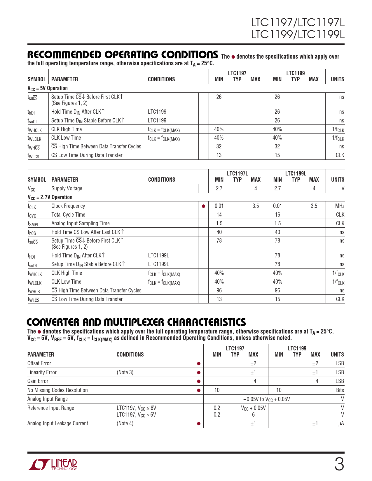 C. VCC = 5V, VREF = 5V, fCLK = fCLK(MAX) as defined in Recommended Operating Conditions, unless otherwise noted. LTC1197 LTC1199 PARAMETER CONDITIONS MIN TYP MAX MIN TYP MAX UNITS