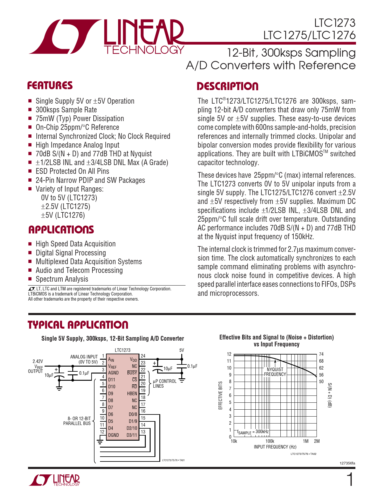 LTC1273 LTC1275/LTC1276 12-Bit, 300ksps Sampling A/D Converters with Reference UFEATURESDESCRIPTIO ■ Single Supply 5V or ±5V Operation The LTC®1273/LTC1275/LTC1276 are 300ksps, sam- ■ 300ksps Sample Rate pling 12-bit A/D converters that draw only 75mW from ■ 75mW (Typ) Power Dissipation single 5V or ±5V supplies. These easy-to-use devices ■ On-Chip 25ppm/°C Reference come complete with 600ns sample-and-holds, precision ■ Internal Synchronized Clock; No Clock Required references and internally trimmed clocks. Unipolar and ■ High Impedance Analog Input bipolar conversion modes provide flexibility for various ■ 70dB S/(N + D) and 77dB THD at Nyquist applications. They are built with LTBiCMOSTM switched ■ ±1/2LSB INL and ±3/4LSB DNL Max (A Grade) capacitor technology. ■ ESD Protected On All Pins These devices have 25ppm/°C (max) internal references. ■ 24-Pin Narrow PDIP and SW Packages The LTC1273 converts 0V to 5V unipolar inputs from a ■ Variety of Input Ranges: single 5V supply. The LTC1275/LTC1276 convert ±2.5V 0V to 5V (LTC1273) and ±5V respectively from ±5V supplies. Maximum DC ±2.5V (LTC1275) specifications include ±1/2LSB INL, ±3/4LSB DNL and ±5V (LTC1276) 25ppm/°C full scale drift over temperature. Outstanding U AC performance includes 70dB S/(N + D) and 77dB THD APPLICATIO S at the Nyquist input frequency of 150kHz. ■ High Speed Data Acquisition ■ The internal clock is trimmed for 2.7µs maximum conver- Digital Signal Processing sion time. The clock automatically synchronizes to each ■ Multiplexed Data Acquisition Systems sample command eliminating problems with asynchro- ■ Audio and Telecom Processing ■ nous clock noise found in competitive devices. A high Spectrum Analysis speed parallel interface eases connections to FIFOs, DSPs , LT, LTC and LTM are registered trademarks of Linear Technology Corporation. LTBiCMOS is a trademark of Linear Technology Corporation. and microprocessors. All other trademarks are the property of their respective owners. UTYPICAL APPLICATIOSingle 5V Supply, 300ksps, 12-Bit Sampling A/D ConverterEffective Bits and Signal to (Noise + Distortion)vs Input Frequency LTC1273 5V 1 24 12 74 ANALOG INPUT AIN VDD 2.42V (0V TO 5V) 2 23 + 11 68 V V REF REF NC 0.1µF + 3 22 10µF 10 62 OUTPUT NYQUIST 0.1µF AGND BUSY 10µF FREQUENCY 4 21 9 56 D11 CS µP CONTROL 5 20 8 50 S/(N + D) (dB) D10 RD LINES 6 19 7 D9 HBEN 6 7 18 D8 NC 8 17 5 D7 NC EFFECTIVE BITS 9 16 4 D6 D0/8 3 8- OR 12-BIT 10 15 D5 D1/9 PARALLEL BUS 11 14 2 D4 D2/10 12 13 1 fSAMPLE = 300kHz DGND D3/11 0 10k 100k 1M 2M INPUT FREQUENCY (Hz) LTC1273/75/76 • TA02 LTC1273/75/76 • TA01 127356fa 1
