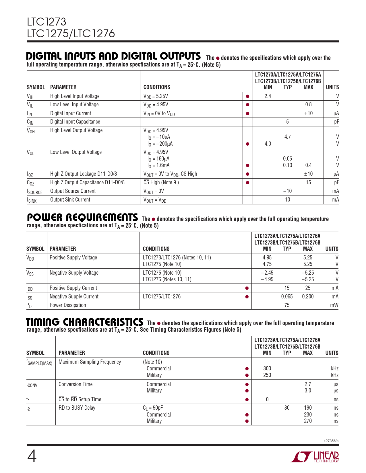 C. See Timing Characteristics Figures (Note 5) LTC1273A/LTC1275A/LTC1276A LTC1273B/LTC1275B/LTC1276B SYMBOL PARAMETER CONDITIONS MIN TYP MAX UNITS