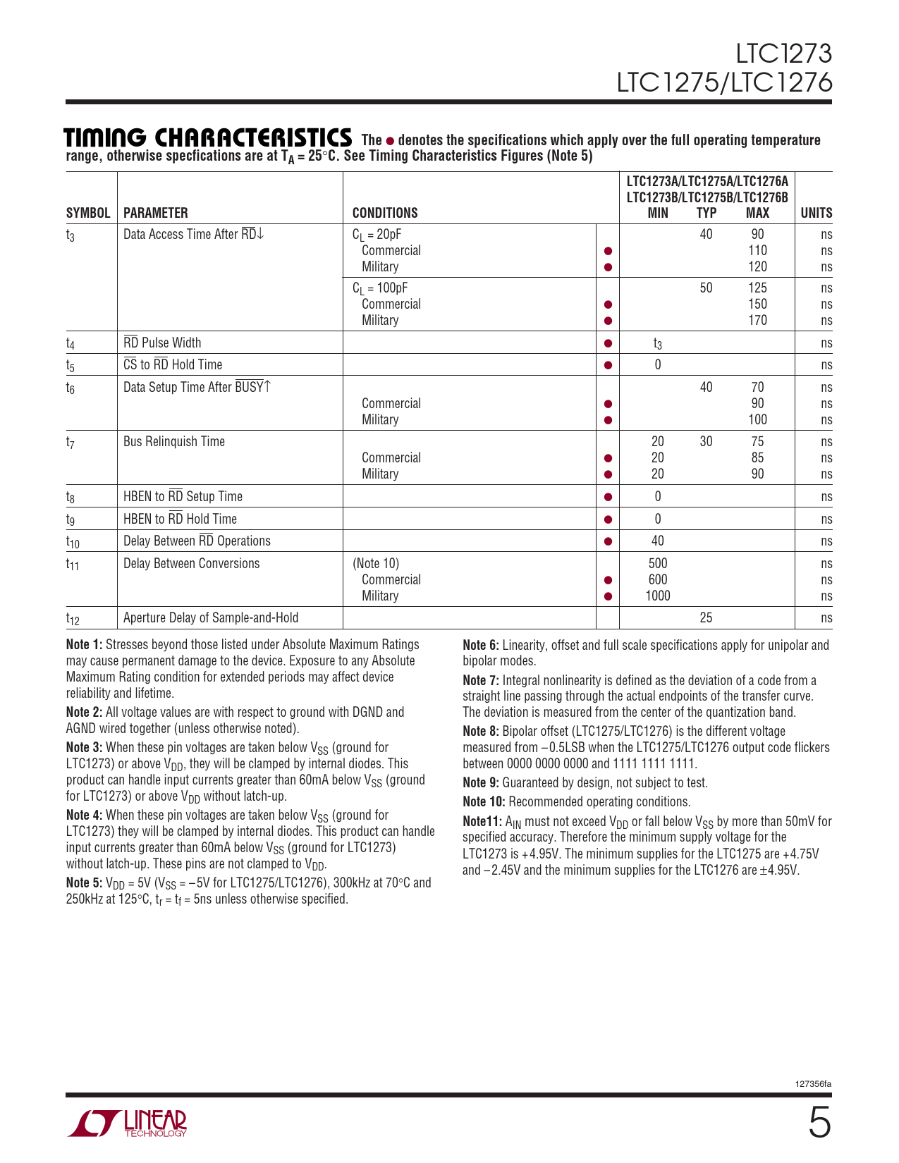 C. See Timing Characteristics Figures (Note 5) LTC1273A/LTC1275A/LTC1276A LTC1273B/LTC1275B/LTC1276B SYMBOL PARAMETER CONDITIONS MIN TYP MAX UNITS
