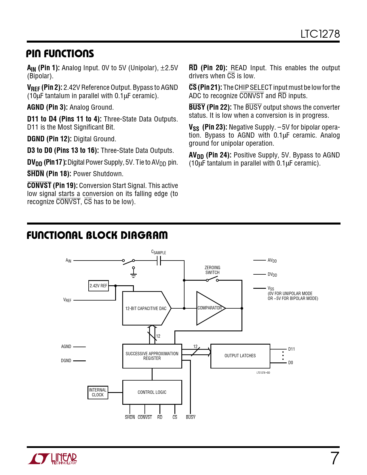 CSAMPLE A AV IN DD ZEROING SWITCH DVDD 2.42V REF VSS (0V FOR UNIPOLAR MODE V OR –5V FOR BIPOLAR MODE) REF 12-BIT CAPACITIVE DAC COMPARATOR 12 AGND 12 D11 SUCCESSIVE APPROXIMATION • OUTPUT LATCHES • REGISTER • DGND D0 LTC1278 • BD INTERNAL CONTROL LOGIC CLOCK SHDN CONVST RD CS BUSY 7