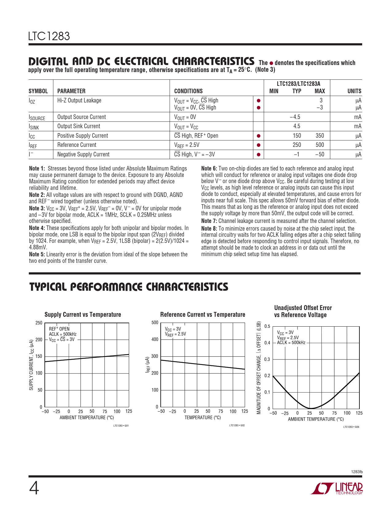LTC1283 UDIGITAL A D DC ELECTRICAL CHCARA TER SI TICSThe ● denotes the specifications whichapply over the full operating temperature range, otherwise specifications are at TA = 25 ° C. (Note 3)LTC1283/LTC1283ASYMBOLPARAMETERCONDITIONSMINTYPMAXUNITS IOZ Hi-Z Output Leakage VOUT = VCC, CS High ● 3 μA VOUT = 0V, CS High ● – 3 μA ISOURCE Output Source Current VOUT = 0V – 4.5 mA ISINK Output Sink Current VOUT = VCC 4.5 mA ICC Positive Supply Current CS High, REF + Open ● 150 350 μA IREF Reference Current VREF = 2.5V ● 250 500 μA I – Negative Supply Current CS High, V – = – 3V ● –1 – 50 μA Note 1: Stresses beyond those listed under Absolute Maximum Ratings Note 6: Two on-chip diodes are tied to each reference and analog input may cause permanent damage to the device. Exposure to any Absolute which will conduct for reference or analog input voltages one diode drop Maximum Rating condition for extended periods may affect device below V – or one diode drop above VCC. Be careful during testing at low reliability and lifetime. VCC levels, as high level reference or analog inputs can cause this input Note 2: All voltage values are with respect to ground with DGND, AGND diode to conduct, especially at elevated temperatures, and cause errors for and REF – wired together (unless otherwise noted). inputs near full scale. This spec allows 50mV forward bias of either diode. Note 3: V + – This means that as long as the reference or analog input does not exceed CC = 3V, VREF = 2.5V, VREF = 0V, V – = 0V for unipolar mode and – 3V for bipolar mode, ACLK = 1MHz, SCLK = 0.25MHz unless the supply voltage by more than 50mV, the output code will be correct. otherwise specified. Note 7: Channel leakage current is measured after the channel selection. Note 4: These specifications apply for both unipolar and bipolar modes. In Note 8: To minimize errors caused by noise at the chip select input, the bipolar mode, one LSB is equal to the bipolar input span (2VREF) divided internal circuitry waits for two ACLK falling edges after a chip select falling by 1024. For example, when VREF = 2.5V, 1LSB (bipolar) = 2(2.5V)/1024 = edge is detected before responding to control input signals. Therefore, no 4.88mV. attempt should be made to clock an address in or data out until the Note 5: Linearity error is the deviation from ideal of the slope between the minimum chip select setup time has elapsed. two end points of the transfer curve. WUTYPICAL PERFOR A CE CHCARA TERISTICSUnadjusted Offset ErrorSupply Current vs TemperatureReference Current vs Temperaturevs Reference Voltage 250 500 0.5 REF+ OPEN VCC = 3V ACLK = 500kHz V ⎪ (LSB) VCC = 3V REF = 2.5V 200 V V CC = CS = 3V REF = 2.5V 400 μA) 0.4 ACLK = 500kHz ( OFFSET CC ⎪Δ 150 300 0.3 μA) ( 100 I REF 200 0.2 SUPPLY CURRENT, I 50 100 0.1 0 0 0 –50 –25 0 25 50 75 100 125 –50 –25 0 25 50 75 100 125 MAGNITUDE OF OFFSET CHANGE, –50 –25 0 25 50 75 100 125 AMBIENT TEMPERATURE (°C) TEMPERATURE (°C) AMBIENT TEMPERATURE (°C) LTC1283 • G01 LTC1283 • G02 LTC1283 • G06 1283fb 4