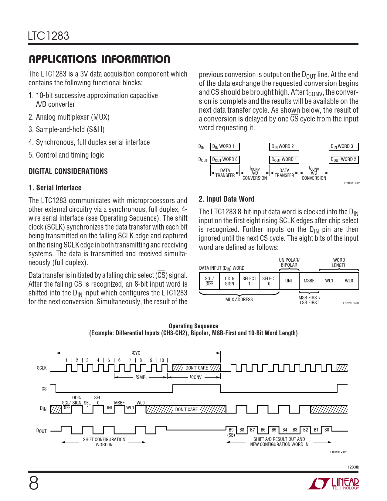 LTC1283 OUUWUAPPLICATIS I FOR ATIO The LTC1283 is a 3V data acquisition component which previous conversion is output on the DOUT line. At the end contains the following functional blocks: of the data exchange the requested conversion begins 1. 10-bit successive approximation capacitive and CS should be brought high. After tCONV, the conver- A/D converter sion is complete and the results will be available on the next data transfer cycle. As shown below, the result of 2. Analog multiplexer (MUX) a conversion is delayed by one CS cycle from the input 3. Sample-and-hold (S&H) word requesting it. 4. Synchronous, full duplex serial interface DIN DIN WORD 1 D D IN WORD 2 IN WORD 3 5. Control and timing logic DOUT DOUT WORD 0 D D OUT WORD 1 OUT WORD 2 DIGITAL CONSIDERATIONS t t DATA CONV DATA CONV A/D A/D TRANSFER TRANSFER CONVERSION CONVERSION LTC1283 • AI02 1. Serial Interface The LTC1283 communicates with microprocessors and 2. Input Data Word other external circuitry via a synchronous, full duplex, 4- The LTC1283 8-bit input data word is clocked into the DIN wire serial interface (see Operating Sequence). The shift input on the first eight rising SCLK edges after chip select clock (SCLK) synchronizes the data transfer with each bit is recognized. Further inputs on the DIN pin are then being transmitted on the falling SCLK edge and captured ignored until the next CS cycle. The eight bits of the input on the rising SCLK edge in both transmitting and receiving word are defined as follows: systems. The data is transmitted and received simulta- neously (full duplex). UNIPOLAR/ WORD BIPOLAR LENGTH DATA INPUT (DIN) WORD: Data transfer is initiated by a falling chip select (CS) signal. SGL/ ODD/ SELECT SELECT After the falling CS is recognized, an 8-bit input word is UNI MSBF WL1 WL0 DIFF SIGN 1 0 shifted into the DIN input which configures the LTC1283 for the next conversion. Simultaneously, the result of the MUX ADDRESS MSB-FIRST/ LSB-FIRST LTC1283 • AI03 Operating Sequence(Example: Differential Inputs (CH3-CH2), Bipolar, MSB-First and 10-Bit Word Length) tCYC 1 2 3 4 5 6 7 8 9 10 SCLK DON’T CARE t t SMPL CONV CS ODD/ SEL SGL/ SIGN SEL 0 MSBF WL0 DIN DIFF 1 UNI WL1 DON’T CARE D B9 B8 B7 B6 B5 B4 B3 B2 B1 B0 OUT (SB) SHIFT CONFIGURATION SHIFT A/D RESULT OUT AND WORD IN NEW CONFIGURATION WORD IN LTC1283 • AI01 1283fb 8