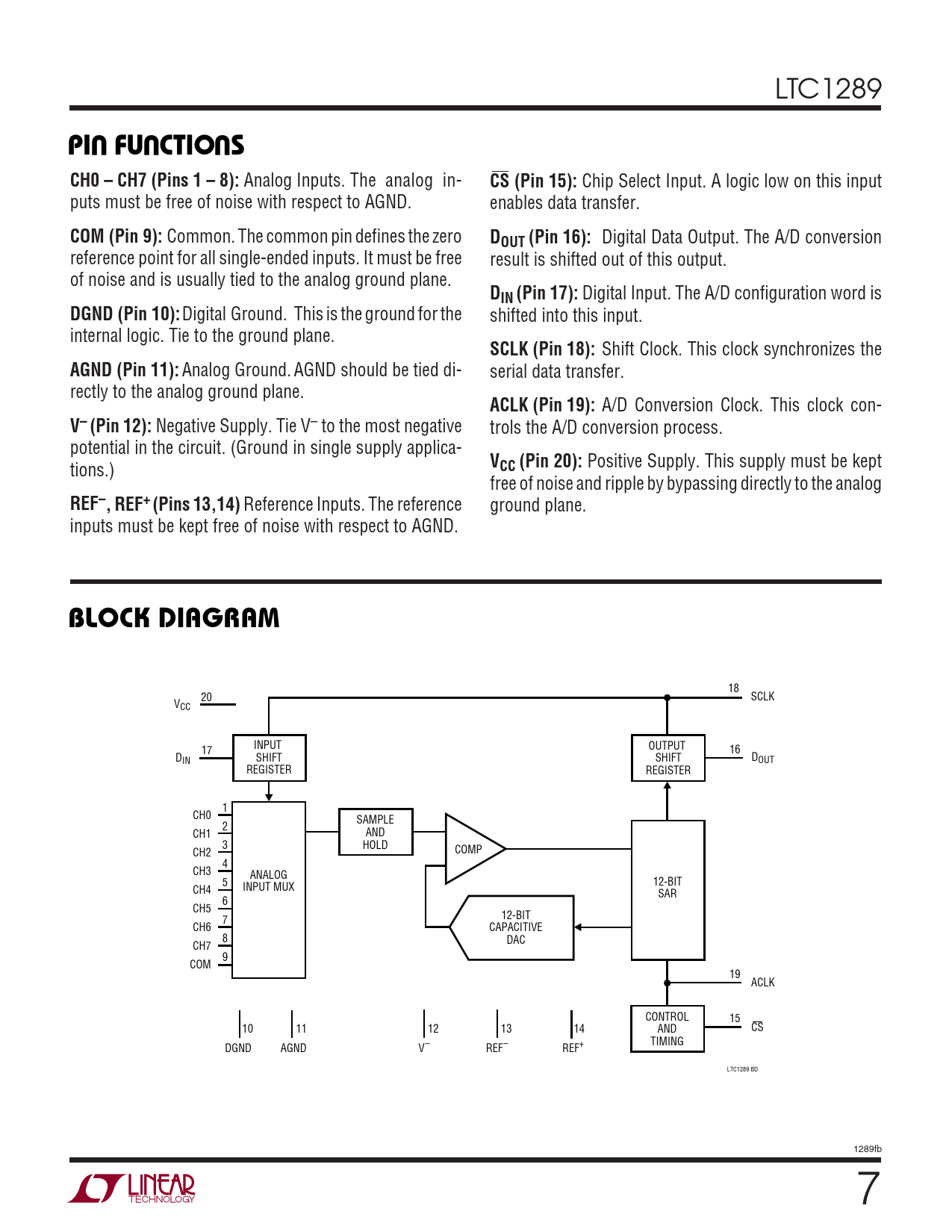 18 20 SCLK VCC INPUT 17 OUTPUT 16 D SHIFT SHIFT D IN OUT REGISTER REGISTER 1 CH0 SAMPLE 2 CH1 AND 3 HOLD CH2 COMP 4 CH3 ANALOG 5 12-BIT INPUT MUX CH4 SAR 6 CH5 12-BIT 7 CH6 CAPACITIVE 8 DAC CH7 9 COM 19 ACLK CONTROL 15 10 11 12 13 14 AND CS TIMING DGND AGND V– REF– REF+ LTC1289 BD 1289fb 7