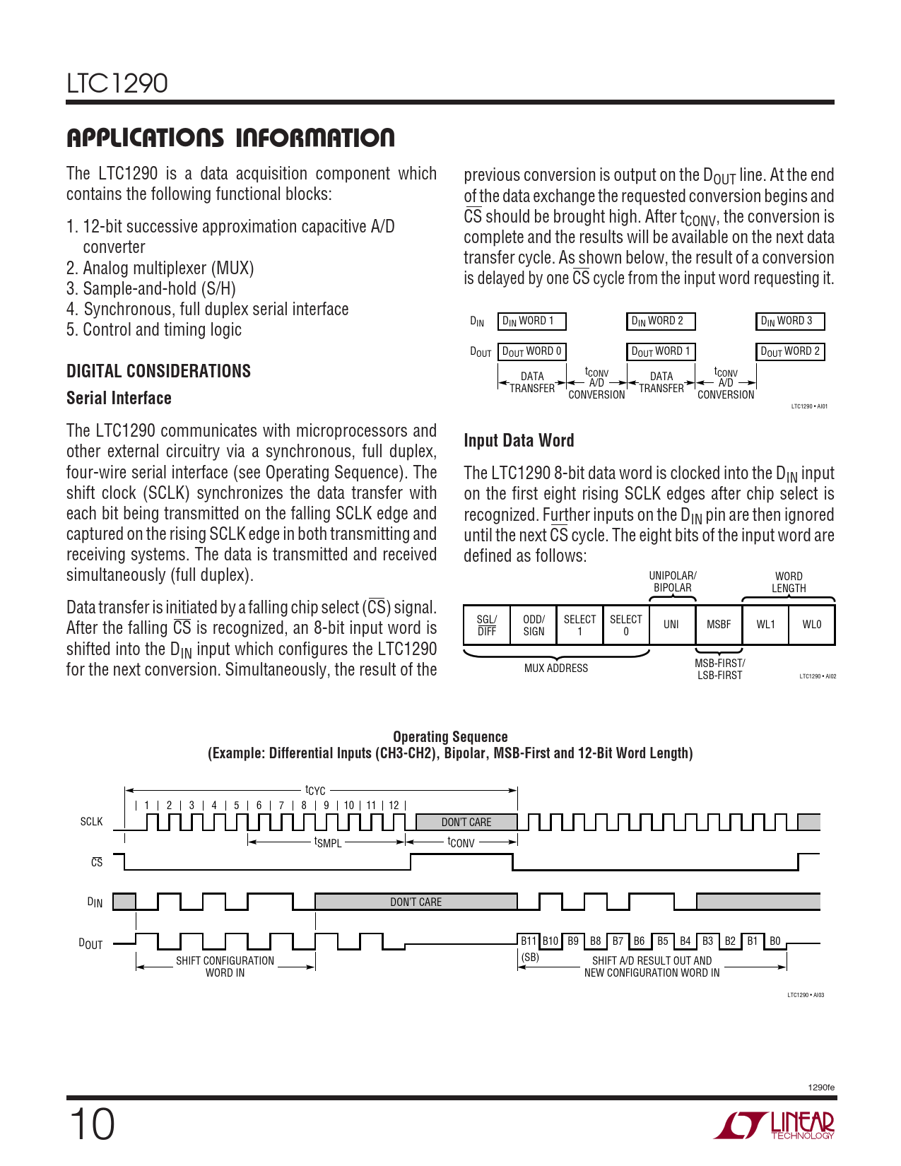 LTC1290 OUUWUAPPLICATIS I FOR ATIO The LTC1290 is a data acquisition component which previous conversion is output on the DOUT line. At the end contains the following functional blocks: of the data exchange the requested conversion begins and CS should be brought high. After tCONV, the conversion is 1. 12-bit successive approximation capacitive A/D complete and the results will be available on the next data converter transfer cycle. As shown below, the result of a conversion 2. Analog multiplexer (MUX) is delayed by one CS cycle from the input word requesting it. 3. Sample-and-hold (S/H) 4. Synchronous, full duplex serial interface D D D D 5. Control and timing logic IN IN WORD 1 IN WORD 2 IN WORD 3 DOUT DOUT WORD 0 D D OUT WORD 1 OUT WORD 2 DIGITAL CONSIDERATIONS t t DATA CONV DATA CONV A/D A/D TRANSFER TRANSFER Serial Interface CONVERSION CONVERSION LTC1290 • AI01 The LTC1290 communicates with microprocessors and Input Data Word other external circuitry via a synchronous, full duplex, four-wire serial interface (see Operating Sequence). The The LTC1290 8-bit data word is clocked into the DIN input shift clock (SCLK) synchronizes the data transfer with on the first eight rising SCLK edges after chip select is each bit being transmitted on the falling SCLK edge and recognized. Further inputs on the DIN pin are then ignored captured on the rising SCLK edge in both transmitting and until the next CS cycle. The eight bits of the input word are receiving systems. The data is transmitted and received defined as follows: simultaneously (full duplex). UNIPOLAR/ WORD BIPOLAR LENGTH Data transfer is initiated by a falling chip select (CS) signal. SGL/ ODD/ SELECT SELECT After the falling CS is recognized, an 8-bit input word is UNI MSBF WL1 WL0 DIFF SIGN 1 0 shifted into the DIN input which configures the LTC1290 for the next conversion. Simultaneously, the result of the MUX ADDRESS MSB-FIRST/ LSB-FIRST LTC1290 • AI02 Operating Sequence(Example: Differential Inputs (CH3-CH2), Bipolar, MSB-First and 12-Bit Word Length) tCYC 1 2 3 4 5 6 7 8 9 10 11 12 SCLK DON’T CARE t t SMPL CONV CS DIN DON’T CARE D B11 B10 B9 B8 B7 B6 B5 B4 B3 B2 B1 B0 OUT SHIFT CONFIGURATION (SB) SHIFT A/D RESULT OUT AND WORD IN NEW CONFIGURATION WORD IN LTC1290 • AI03 1290fe 10