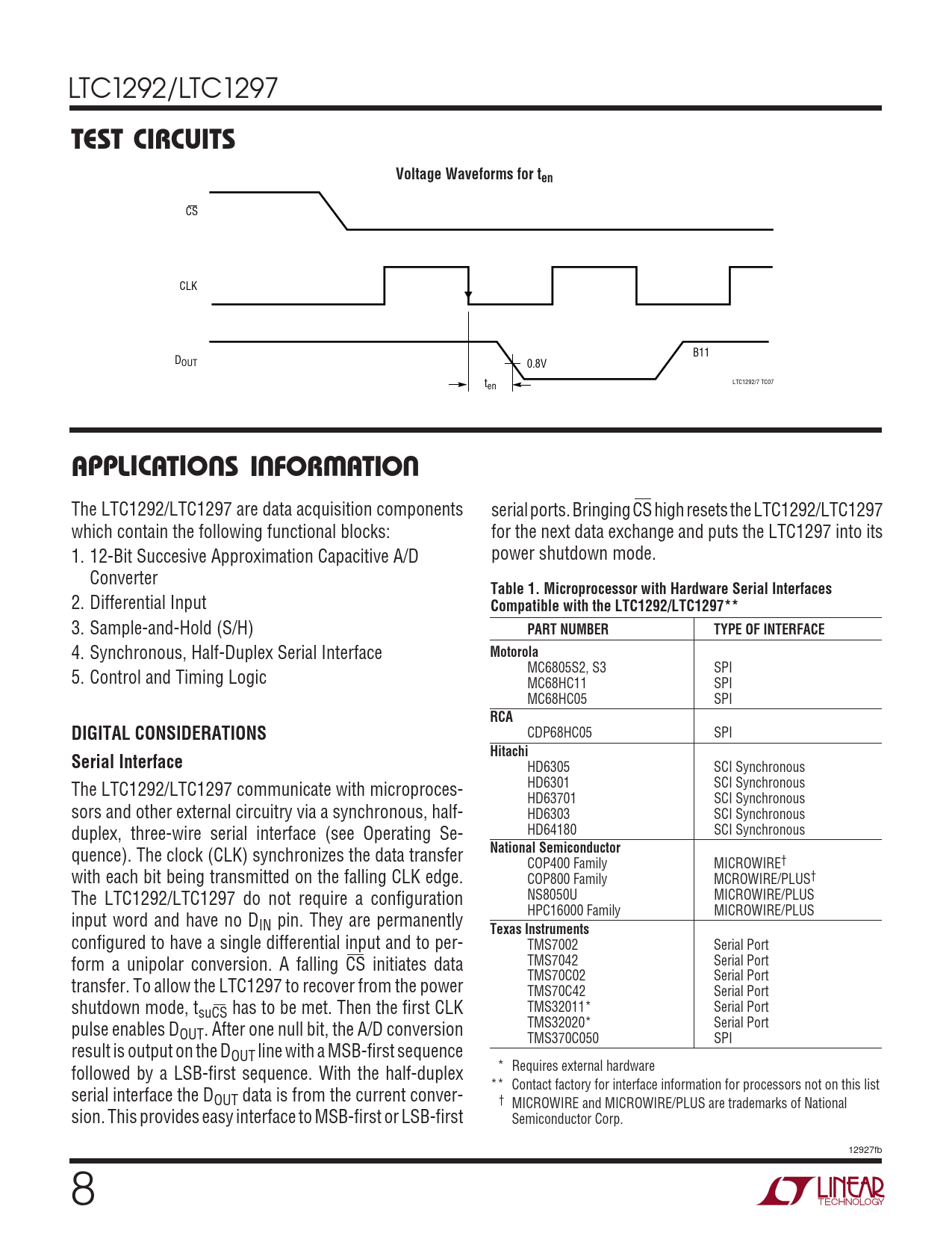 LTC1292/LTC1297 TEST CIRCUITSVoltage Waveforms for ten CS CLK B11 DOUT 0.8V ten LTC1292/7 TC07 OUUWUAPPLICATIS I FOR ATIO The LTC1292/LTC1297 are data acquisition components serial ports. Bringing CS high resets the LTC1292/LTC1297 which contain the following functional blocks: for the next data exchange and puts the LTC1297 into its 1. 12-Bit Succesive Approximation Capacitive A/D power shutdown mode. Converter Table 1. Microprocessor with Hardware Serial Interfaces 2. Differential Input Compatible with the LTC1292/LTC1297** 3. Sample-and-Hold (S/H) PART NUMBERTYPE OF INTERFACE 4. Synchronous, Half-Duplex Serial Interface Motorola MC6805S2, S3 SPI 5. Control and Timing Logic MC68HC11 SPI MC68HC05 SPI RCADIGITAL CONSIDERATIONS CDP68HC05 SPI HitachiSerial Interface HD6305 SCI Synchronous The LTC1292/LTC1297 communicate with microproces- HD6301 SCI Synchronous HD63701 SCI Synchronous sors and other external circuitry via a synchronous, half- HD6303 SCI Synchronous duplex, three-wire serial interface (see Operating Se- HD64180 SCI Synchronous quence). The clock (CLK) synchronizes the data transfer National Semiconductor COP400 Family MICROWIRE† with each bit being transmitted on the falling CLK edge. COP800 Family MCROWIRE/PLUS† The LTC1292/LTC1297 do not require a configuration NS8050U MICROWIRE/PLUS HPC16000 Family MICROWIRE/PLUS input word and have no DIN pin. They are permanently Texas Instruments configured to have a single differential input and to per- TMS7002 Serial Port form a unipolar conversion. A falling CS initiates data TMS7042 Serial Port TMS70C02 Serial Port transfer. To allow the LTC1297 to recover from the power TMS70C42 Serial Port shutdown mode, tsuCS has to be met. Then the first CLK TMS32011* Serial Port pulse enables D TMS32020* Serial Port OUT. After one null bit, the A/D conversion TMS370C050 SPI result is output on the DOUT line with a MSB-first sequence followed by a LSB-first sequence. With the half-duplex * Requires external hardware ** Contact factory for interface information for processors not on this list serial interface the DOUT data is from the current conver- † MICROWIRE and MICROWIRE/PLUS are trademarks of National sion. This provides easy interface to MSB-first or LSB-first Semiconductor Corp. 12927fb 8