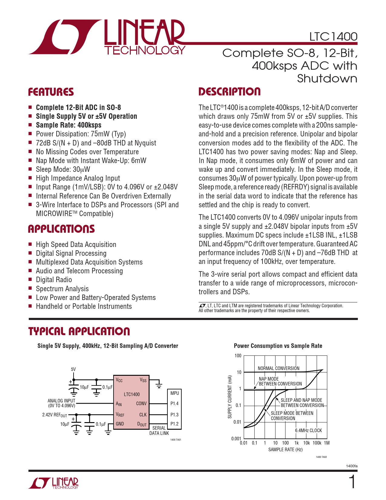 The LTC®1400 is a complete 400ksps, 12-bit A/D converter ■