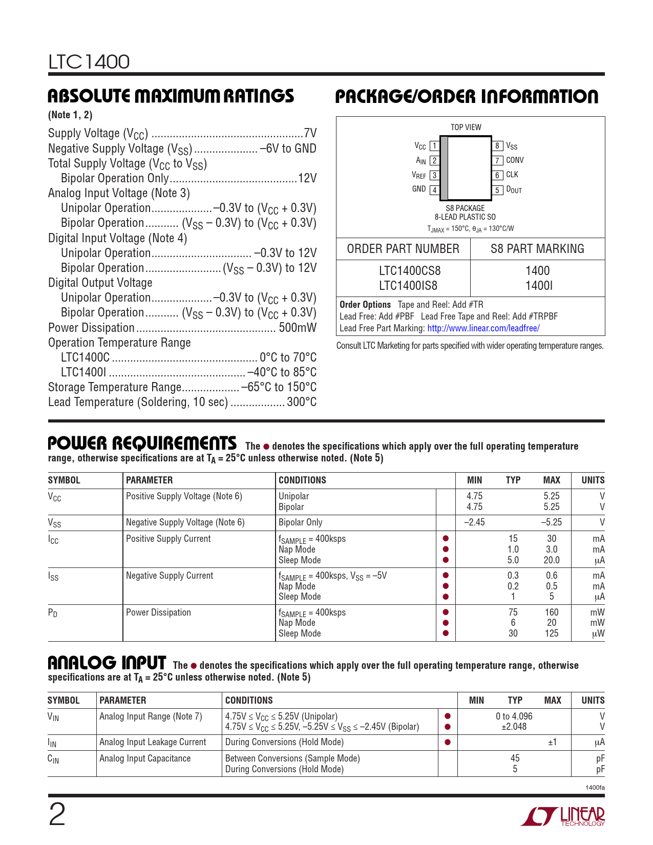 Bipolar Operation ... (V Tape and Reel: Add #TR SS – 0.3V) to (VCC + 0.3V) Lead Free: Add #PBF Lead Free Tape and Reel: Add #TRPBF Power Dissipation .. 500mW Lead Free Part Marking: http://www.linear.com/leadfree/ Operation Temperature Range Consult LTC Marketing for parts specified with wider operating temperature ranges. LTC1400C .. 0°C to 70°C LTC1400I ... –40°C to 85°C Storage Temperature Range ... –65°C to 150°C Lead Temperature (Soldering, 10 sec) .. 300°C