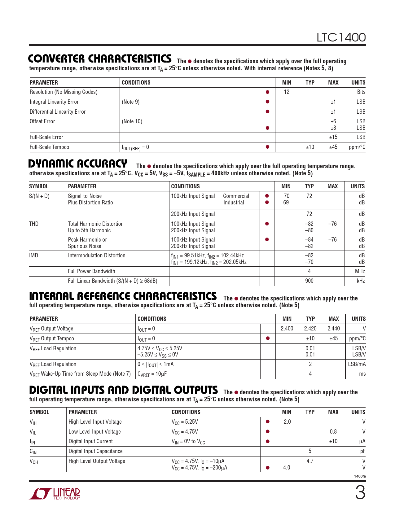 denotes the specifications which apply over the full operating temperature range, otherwise specifications are at TA = 25°C. VCC = 5V, VSS = –5V, fSAMPLE = 400kHz unless otherwise noted. (Note 5) SYMBOL PARAMETER CONDITIONS MIN TYP MAX UNITS