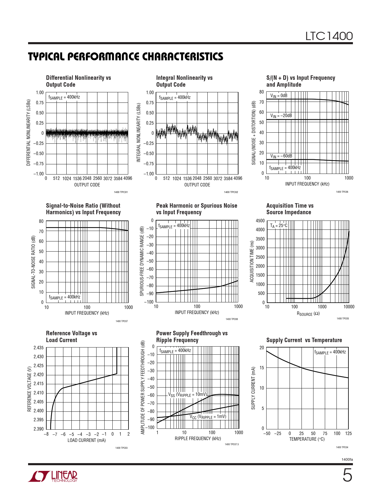 2.435 0 20 fSAMPLE = 400kHz fSAMPLE = 400kHz 2,430 –10 –20 2.425 15 –30 2.420 –40 2.415 –50 10 2.410 –60 VSS (VRIPPLE = 10mV) 2.405 –70 REFERENCE VOLTAGE (V) SUPPLY CURRENT (mA) 2.400 5 –80 V 2.395 –90 CC (VRIPPLE = 1mV) 2.390 –100 0 –8 –7 –6 –5 –4 –3 –2 –1 0 1 2 AMPLITUDE OF POWER SUPPLY FEEDTHROUGH (dB) 1 10 100 1000 –50 –25 0 25 50 75 100 125 LOAD CURRENT (mA) RIPPLE FREQUENCY (kHz) TEMPERATURE (°C) 1400 TPC07.5 1400 TPC03 1400 TPC04 1400fa 5