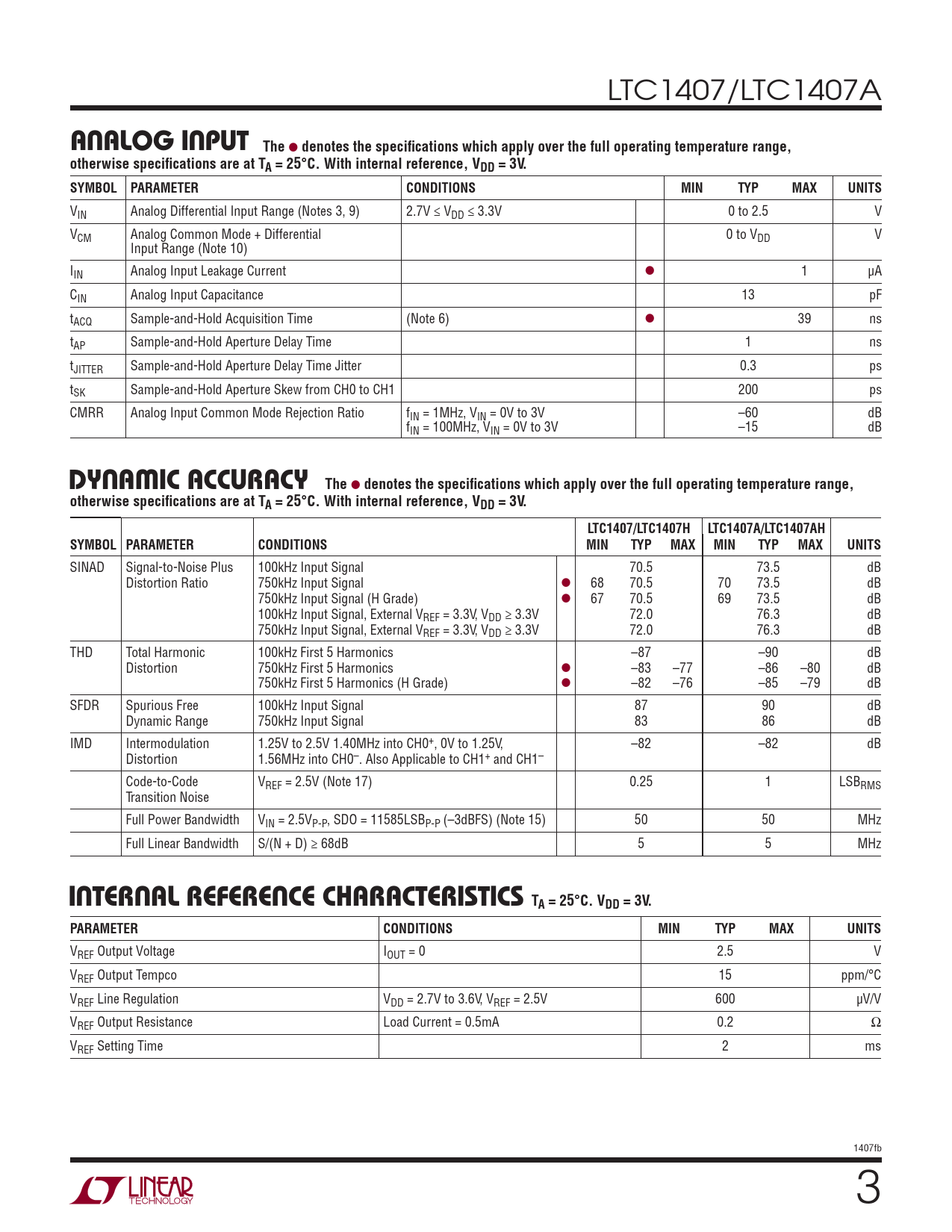 LTC1407/LTC1407A TheANALOG INPUT l denotes the specifi cations which apply over the full operating temperature range,otherwise specifi cations are at TA = 25°C. With internal reference, VDD = 3V. SYMBOL PARAMETERCONDITIONSMINTYPMAXUNITS VIN Analog Differential Input Range (Notes 3, 9) 2.7V ≤ VDD ≤ 3.3V 0 to 2.5 V VCM Analog Common Mode + Differential 0 to VDD V Input Range (Note 10) IIN Analog Input Leakage Current l 1 μA CIN Analog Input Capacitance 13 pF tACQ Sample-and-Hold Acquisition Time (Note 6) l 39 ns tAP Sample-and-Hold Aperture Delay Time 1 ns tJITTER Sample-and-Hold Aperture Delay Time Jitter 0.3 ps tSK Sample-and-Hold Aperture Skew from CH0 to CH1 200 ps CMRR Analog Input Common Mode Rejection Ratio fIN = 1MHz, VIN = 0V to 3V –60 dB fIN = 100MHz, VIN = 0V to 3V –15 dB DYNAMIC ACCURACYThe l denotes the specifi cations which apply over the full operating temperature range,otherwise specifi cations are at TA = 25°C. With internal reference, VDD = 3V.LTC1407/LTC1407HLTC1407A/LTC1407AHSYMBOL PARAMETERCONDITIONSMINTYPMAXMINTYPMAXUNITS SINAD Signal-to-Noise Plus 100kHz Input Signal 70.5 73.5 dB Distortion Ratio 750kHz Input Signal l 68 70.5 70 73.5 dB 750kHz Input Signal (H Grade) l 67 70.5 69 73.5 dB 100kHz Input Signal, External VREF = 3.3V, VDD ≥ 3.3V 72.0 76.3 dB 750kHz Input Signal, External VREF = 3.3V, VDD ≥ 3.3V 72.0 76.3 dB THD Total Harmonic 100kHz First 5 Harmonics –87 –90 dB Distortion 750kHz First 5 Harmonics l –83 –77 –86 –80 dB 750kHz First 5 Harmonics (H Grade) l –82 –76 –85 –79 dB SFDR Spurious Free 100kHz Input Signal 87 90 dB Dynamic Range 750kHz Input Signal 83 86 dB IMD Intermodulation 1.25V to 2.5V 1.40MHz into CH0+, 0V to 1.25V, –82 –82 dB Distortion 1.56MHz into CH0–. Also Applicable to CH1+ and CH1– Code-to-Code VREF = 2.5V (Note 17) 0.25 1 LSBRMS Transition Noise Full Power Bandwidth VIN = 2.5VP-P, SDO = 11585LSBP-P (–3dBFS) (Note 15) 50 50 MHz Full Linear Bandwidth S/(N + D) ≥ 68dB 5 5 MHz INTERNAL REFERENCE CHARACTERISTICS TA = 25°C. VDD = 3V.PARAMETERCONDITIONSMINTYPMAXUNITS VREF Output Voltage IOUT = 0 2.5 V VREF Output Tempco 15 ppm/°C VREF Line Regulation VDD = 2.7V to 3.6V, VREF = 2.5V 600 μV/V VREF Output Resistance Load Current = 0.5mA 0.2 Ω VREF Setting Time 2 ms 1407fb 3