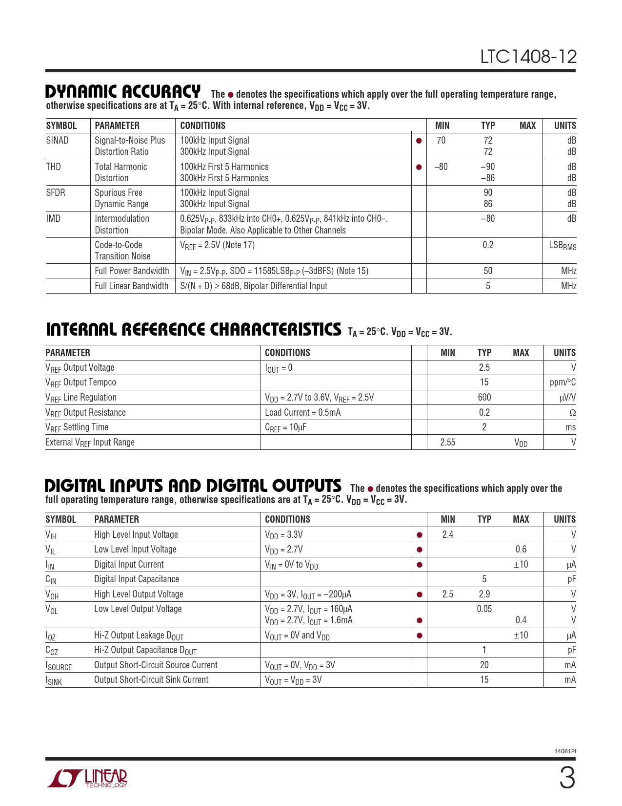 LTC1408-12 UWDY A IC ACCURACY The ● denotes the specifications which apply over the full operating temperature range,otherwise specifications are at TA = 25 ° C. With internal reference, VDD = VCC = 3V.SYMBOLPARAMETERCONDITIONSMINTYPMAXUNITS SINAD Signal-to-Noise Plus 100kHz Input Signal ● 70 72 dB Distortion Ratio 300kHz Input Signal 72 dB THD Total Harmonic 100kHz First 5 Harmonics ● –80 –90 dB Distortion 300kHz First 5 Harmonics –86 dB SFDR Spurious Free 100kHz Input Signal 90 dB Dynamic Range 300kHz Input Signal 86 dB IMD Intermodulation 0.625VP-P, 833kHz into CH0+, 0.625VP-P, 841kHz into CH0–. –80 dB Distortion Bipolar Mode. Also Applicable to Other Channels Code-to-Code VREF = 2.5V (Note 17) 0.2 LSBRMS Transition Noise Full Power Bandwidth VIN = 2.5VP-P, SDO = 11585LSBP-P (–3dBFS) (Note 15) 50 MHz Full Linear Bandwidth S/(N + D) ≥ 68dB, Bipolar Differential Input 5 MHz UUUI TER AL REFERE CE CHARACTERISTICS TA = 25 ° C. VDD = VCC = 3V.PARAMETERCONDITIONSMINTYPMAXUNITS VREF Output Voltage IOUT = 0 2.5 V VREF Output Tempco 15 ppm/°C VREF Line Regulation VDD = 2.7V to 3.6V, VREF = 2.5V 600 µV/V VREF Output Resistance Load Current = 0.5mA 0.2 Ω VREF Settling Time CREF = 10µF 2 ms External VREF Input Range 2.55 VDD V UUDIGITAL I PUTS A D DIGITAL OUTPUTS The ● denotes the specifications which apply over thefull operating temperature range, otherwise specifications are at TA = 25 ° C. VDD = VCC = 3V.SYMBOLPARAMETERCONDITIONSMINTYPMAXUNITS VIH High Level Input Voltage VDD = 3.3V ● 2.4 V VIL Low Level Input Voltage VDD = 2.7V ● 0.6 V IIN Digital Input Current VIN = 0V to VDD ● ±10 µA CIN Digital Input Capacitance 5 pF VOH High Level Output Voltage VDD = 3V, IOUT = – 200µA ● 2.5 2.9 V VOL Low Level Output Voltage VDD = 2.7V, IOUT = 160µA 0.05 V VDD = 2.7V, IOUT = 1.6mA ● 0.4 V IOZ Hi-Z Output Leakage DOUT VOUT = 0V and VDD ● ±10 µA COZ Hi-Z Output Capacitance DOUT 1 pF ISOURCE Output Short-Circuit Source Current VOUT = 0V, VDD = 3V 20 mA ISINK Output Short-Circuit Sink Current VOUT = VDD = 3V 15 mA 140812f 3