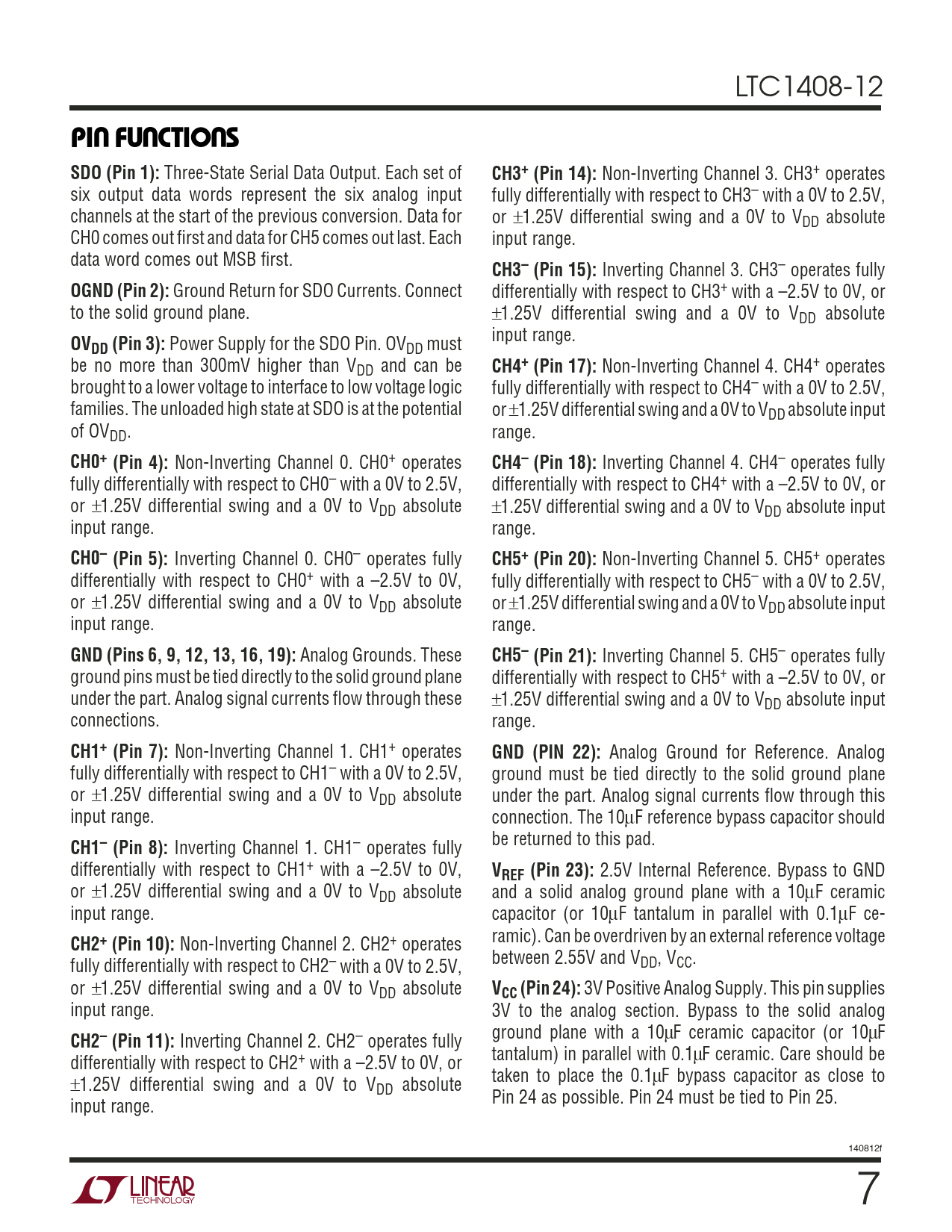 Inverting Channel 2. CH2– operates fully tantalum) in parallel with 0.1µF ceramic. Care should be differentially with respect to CH2+ with a –2.5V to 0V, or ± taken to place the 0.1µF bypass capacitor as close to 1.25V differential swing and a 0V to VDD absolute Pin 24 as possible. Pin 24 must be tied to Pin 25. input range. 140812f 7