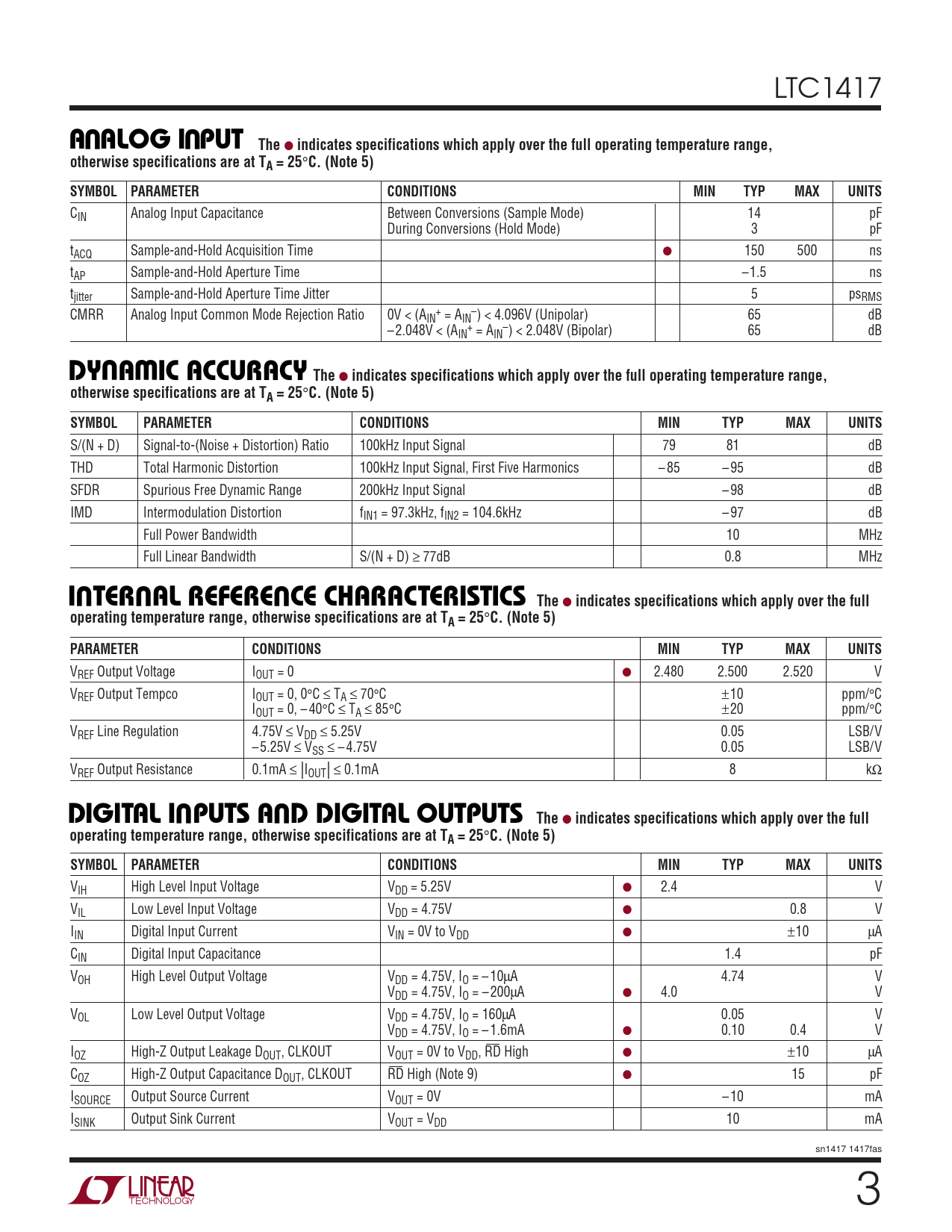 VIH High Level Input Voltage VDD = 5.25V ● 2.4 V VIL Low Level Input Voltage VDD = 4.75V ● 0.8 V IIN Digital Input Current VIN = 0V to VDD ● ±10 µA CIN Digital Input Capacitance 1.4 pF VOH High Level Output Voltage VDD = 4.75V, IO = – 10µA 4.74 V VDD = 4.75V, IO = – 200µA ● 4.0 V VOL Low Level Output Voltage VDD = 4.75V, IO = 160µA 0.05 V VDD = 4.75V, IO = – 1.6mA ● 0.10 0.4 V IOZ High-Z Output Leakage DOUT, CLKOUT VOUT = 0V to VDD, RD High ● ±10 µA COZ High-Z Output Capacitance DOUT, CLKOUT RD High (Note 9) ● 15 pF ISOURCE Output Source Current VOUT = 0V – 10 mA ISINK Output Sink Current VOUT = VDD 10 mA sn1417 1417fas 3